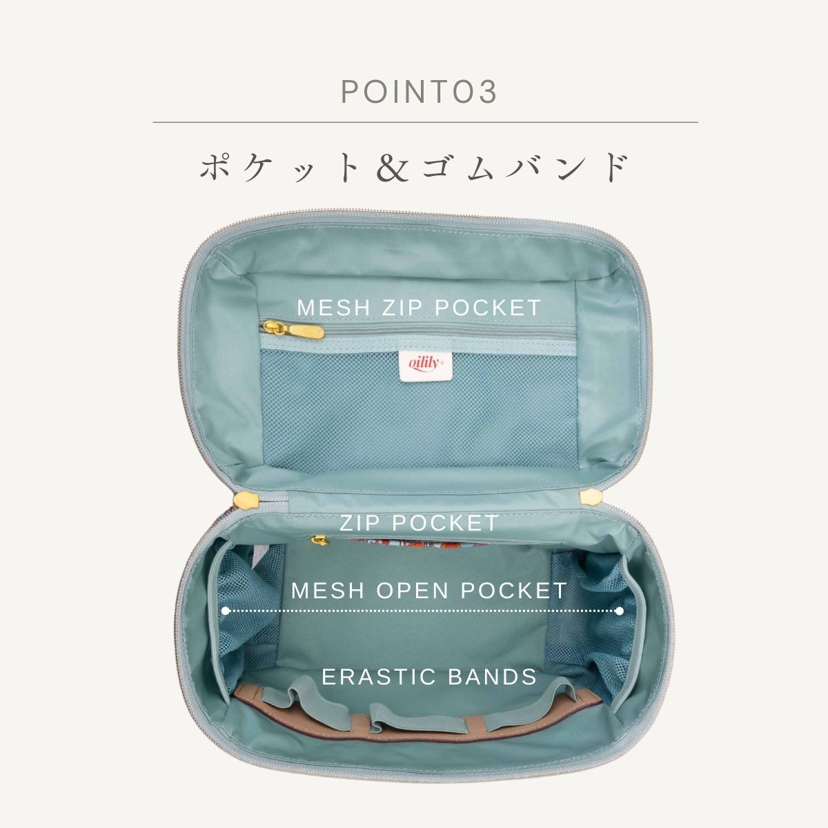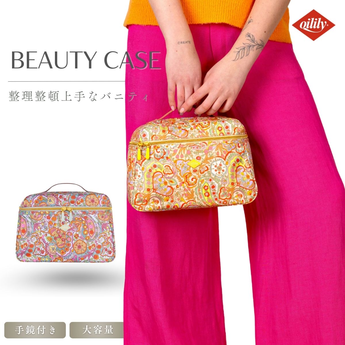 化粧品や化粧道具などをたっぷり収納できる大容量の化粧ポーチ。