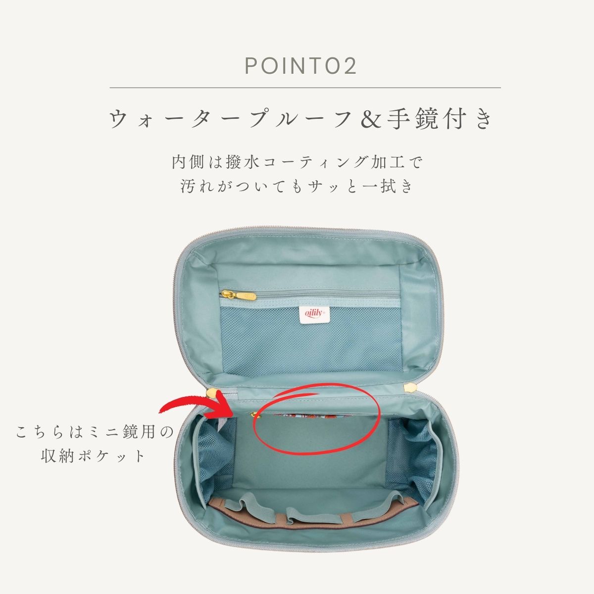 撥水加工がされていて洗面所でも安心。内側は汚れがついてもサッと拭き取れるコーティングがされています。ミニ鏡付き。
