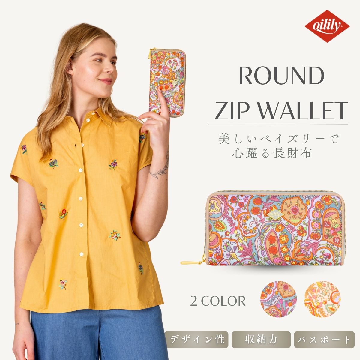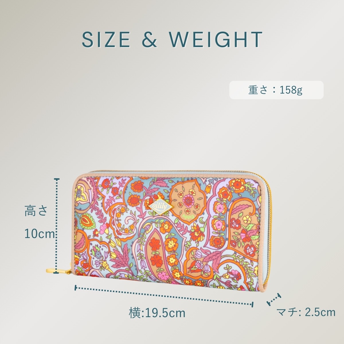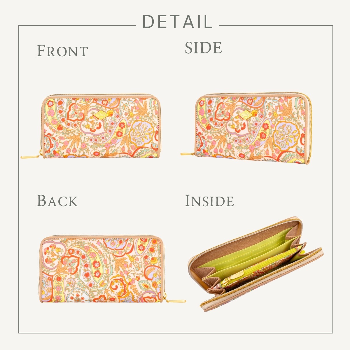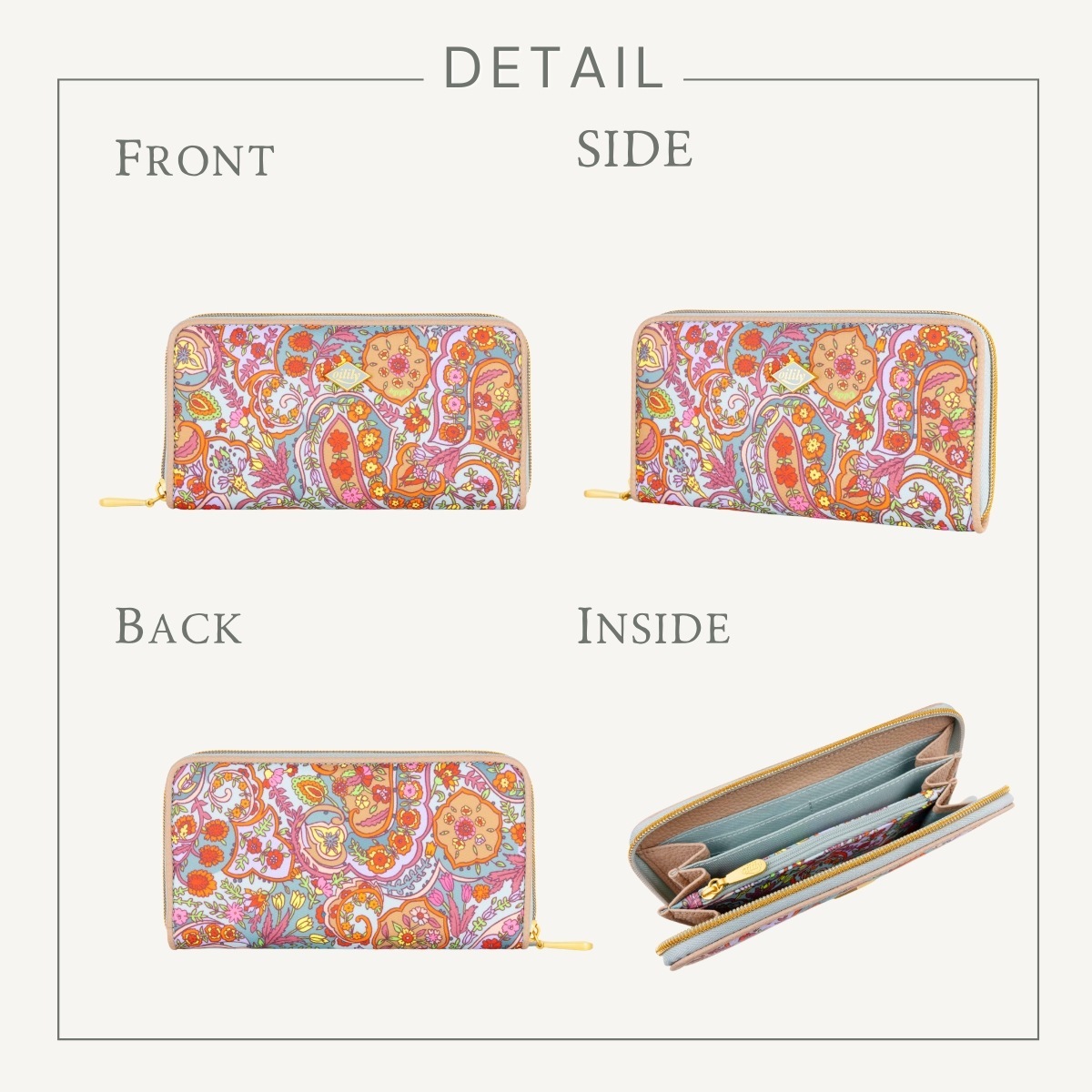 中は3つに分かれていて、お札を用途別に入れることも可能。中央の小銭入れは、ファスナー付き。 この部分に同じフラワープリントでアクセントを付けているのがさすがオイリリーですね! カードを入れる部分は2か所あり、合計8枚とたっぷり収納。さらに通帳やパスポートも入る抜群の収納力で重宝します。 キャッシュレスが進んでもお札をきれいにそのまま収納できる長財布は重宝します今シーズンのペイズリー柄は軽やかに明るく登場。中は3つに分かれていて、お札を用途別に入れることも可能。中央の小銭入れは、ファスナー付き。この部分に同じフラワープリントでアクセントを付けているのがさすがオイリリーですね!カードを入れる部分は2か所あり、合計8枚とたっぷり収納。さらに通帳やパスポートも入る抜群の収納力で重宝します。キャッシュレスが進んでもお札をきれいにそのまま収納できる長財布は重宝します。