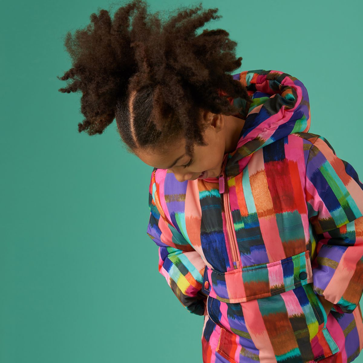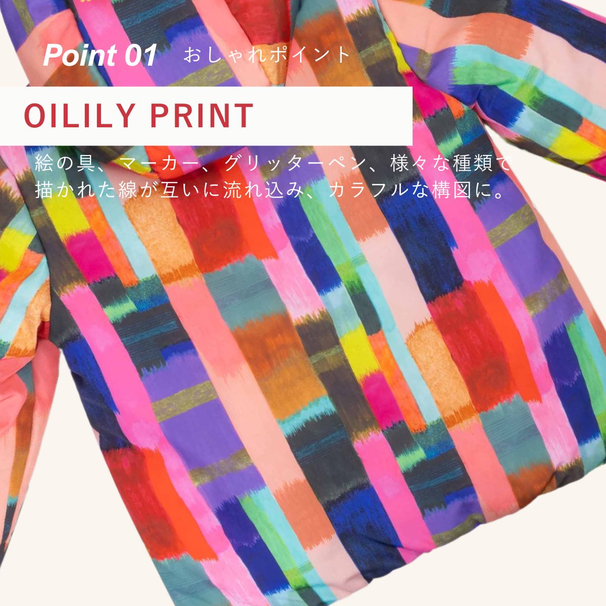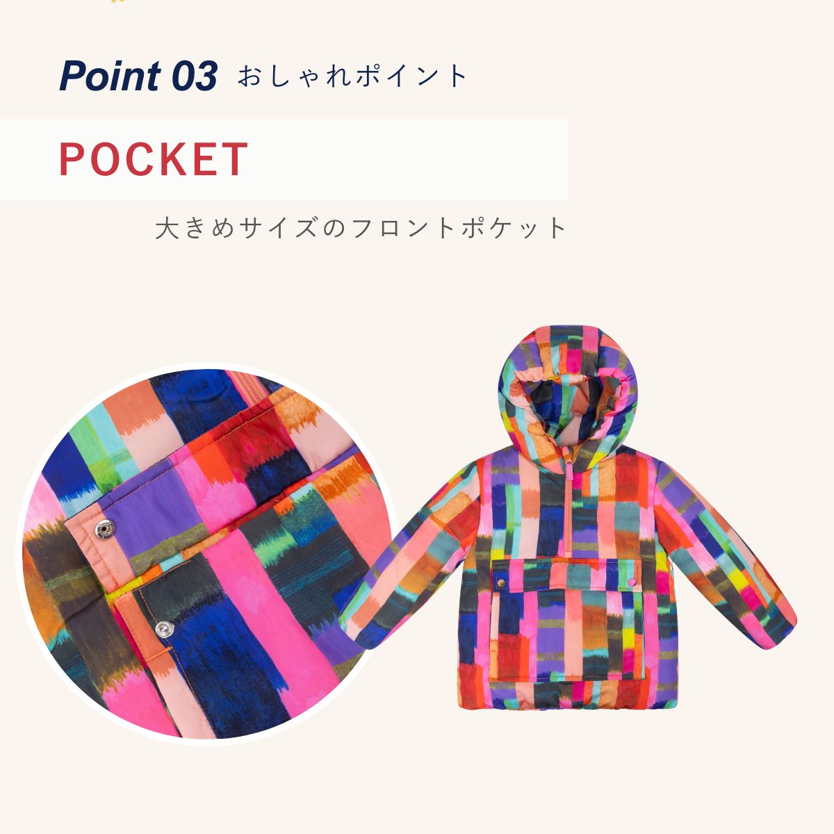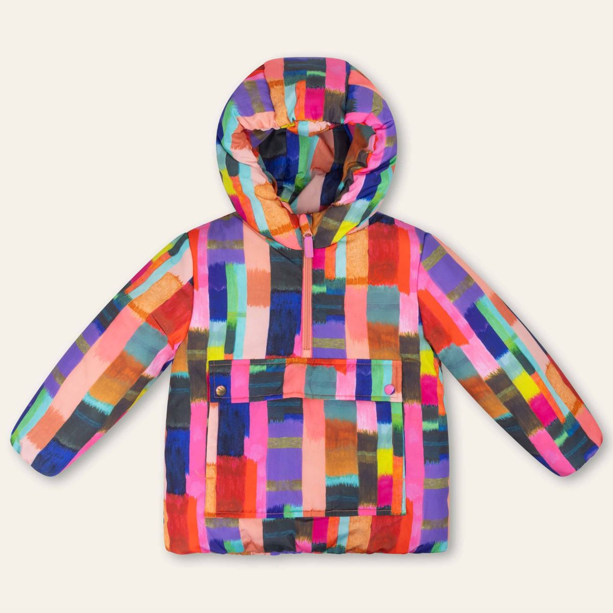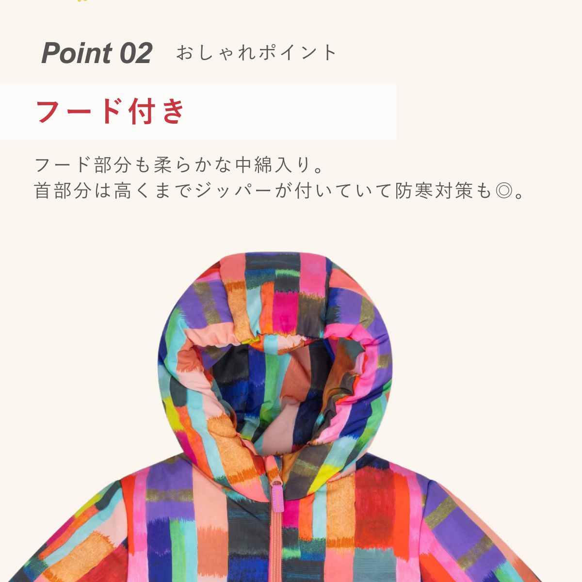 ストライプ×ストライプで色とりどりのアノラックパーカー。中綿入りで暖かさも抜群。ダークになりがちな秋冬コーデをこのアノラックパーカーで元気いっぱい過ごしましょう!