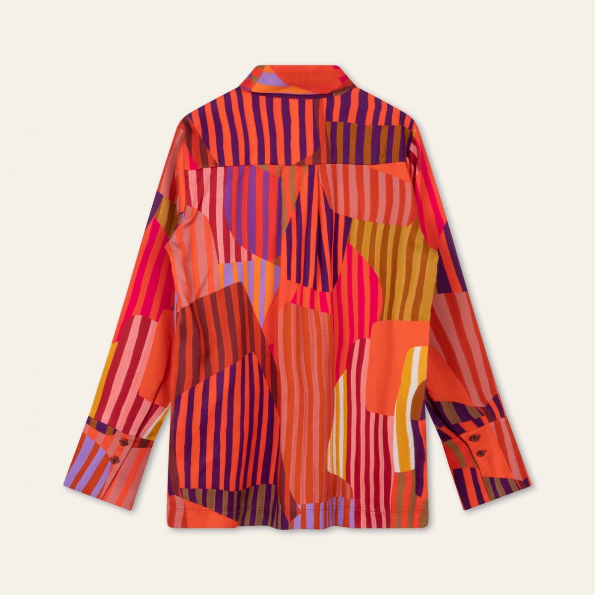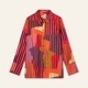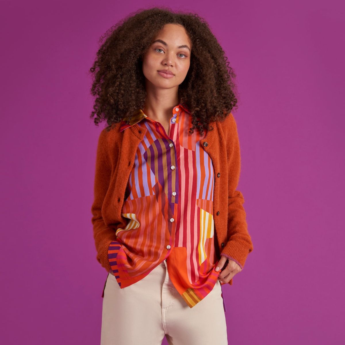 このプリントは「Stripes love Blocks」と名付けられており、その名の通り、この愛らしくゆったりとしたブラウスにはカラフルなストライプがブロックに描かれています。袖口は長めでボタンは 1 つ