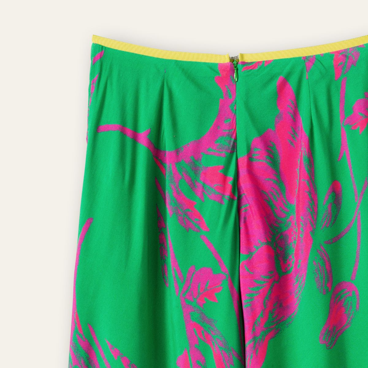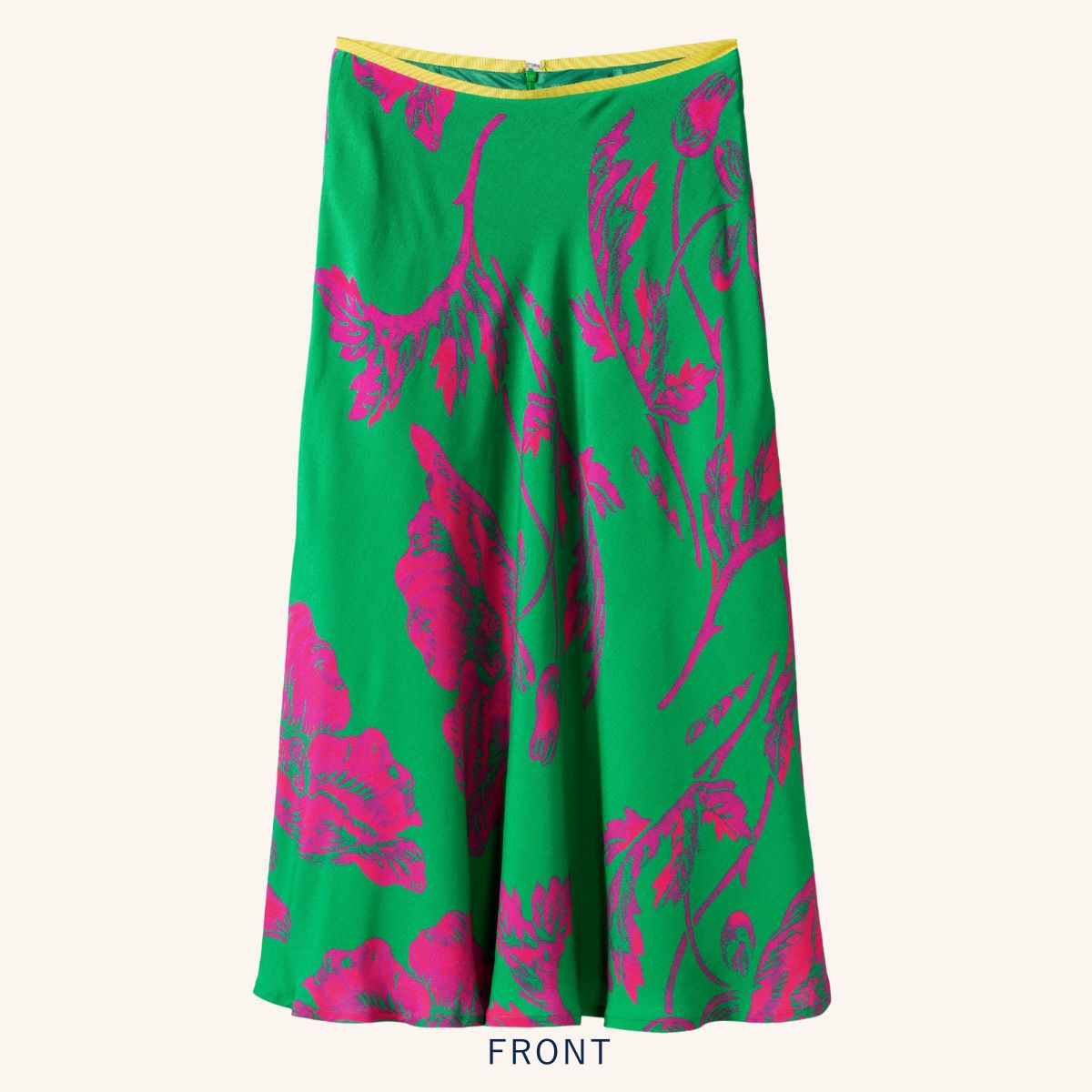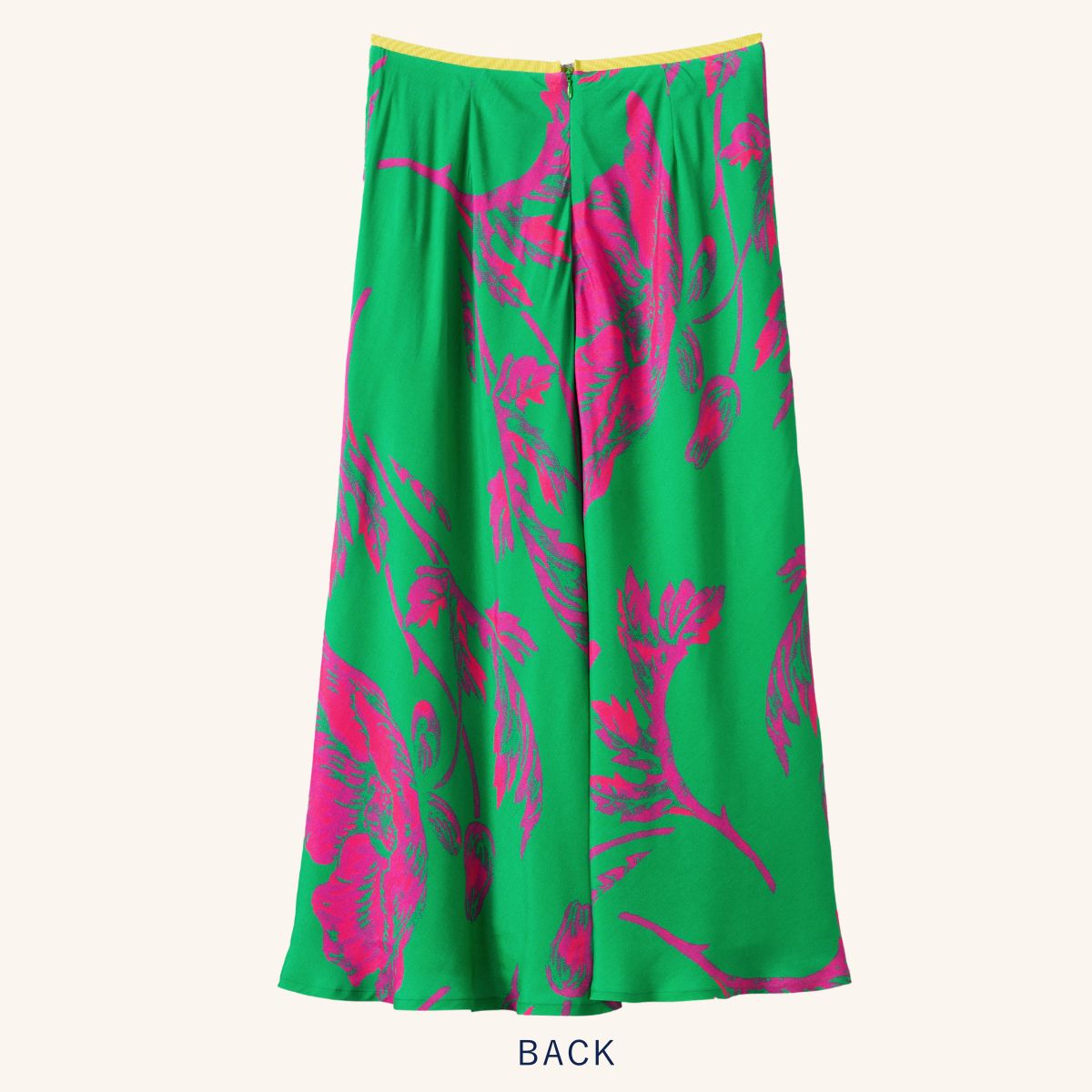 鮮やかなグリーン地にネオンカラーもピンクのお花が鮮やかに咲いたフラワープリントスカート。