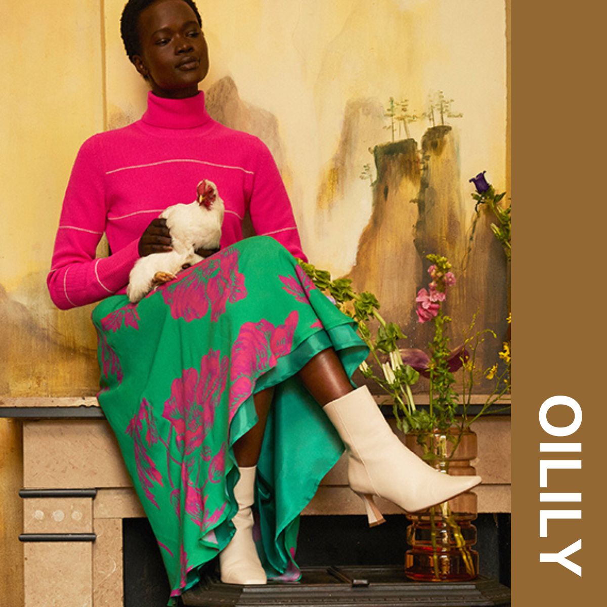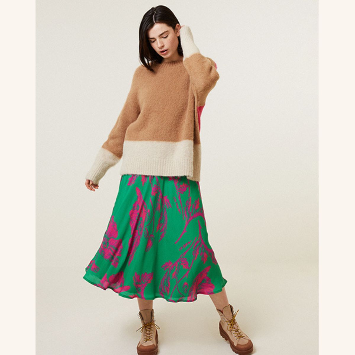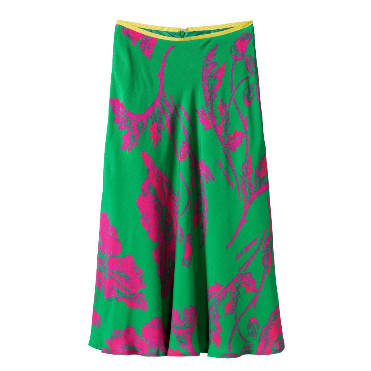 鮮やかなグリーン地にネオンカラーもピンクのお花が鮮やかに咲いたフラワープリントスカート。