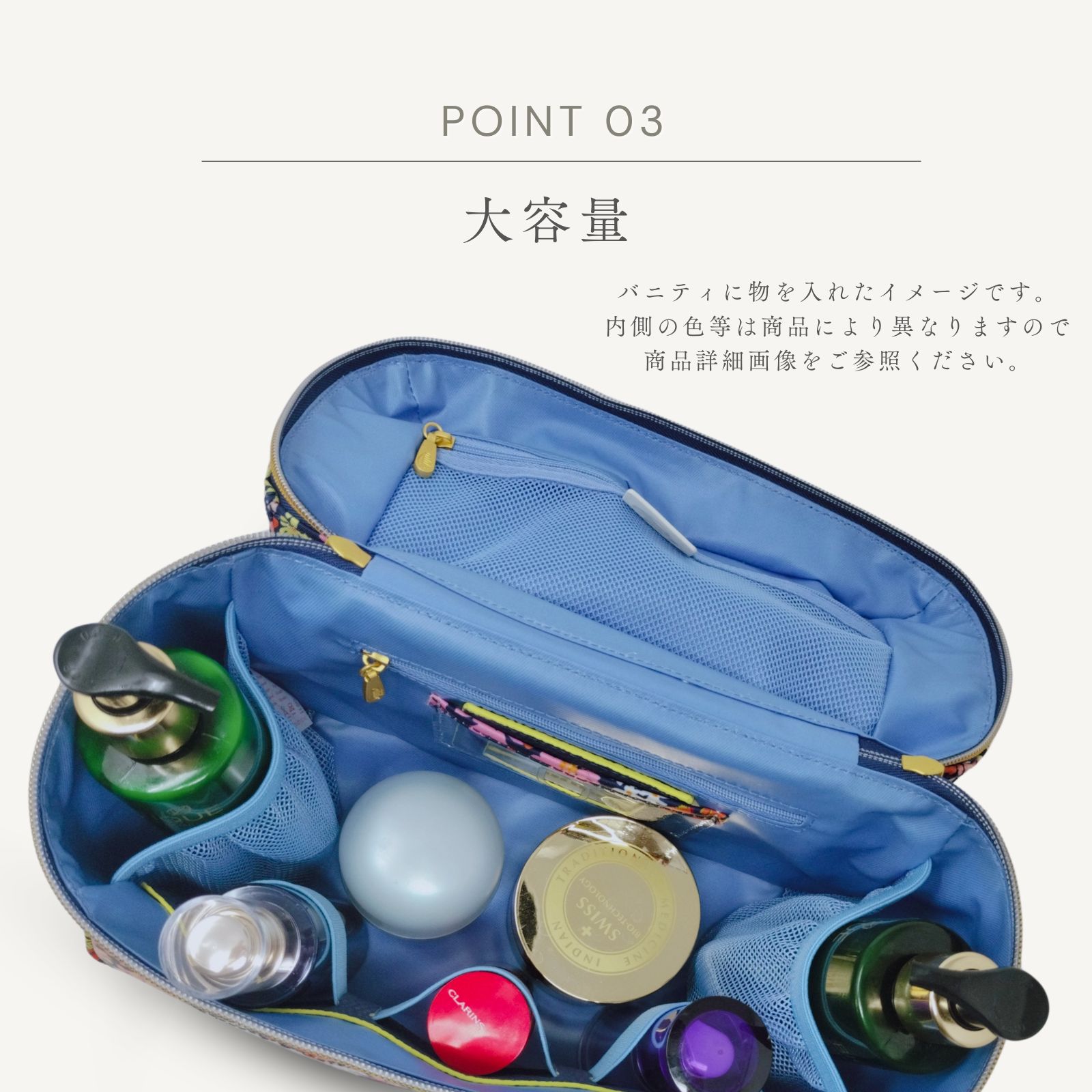 化粧品や化粧道具などをたっぷり収納できる大容量の化粧ポーチです。