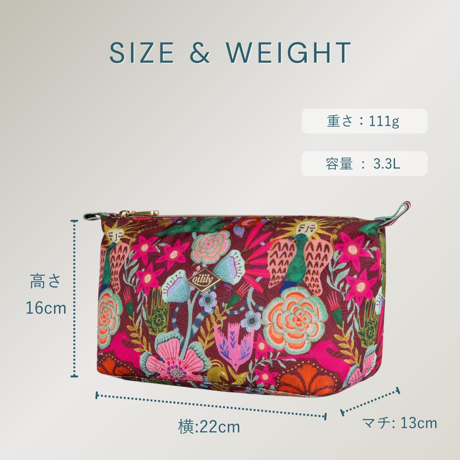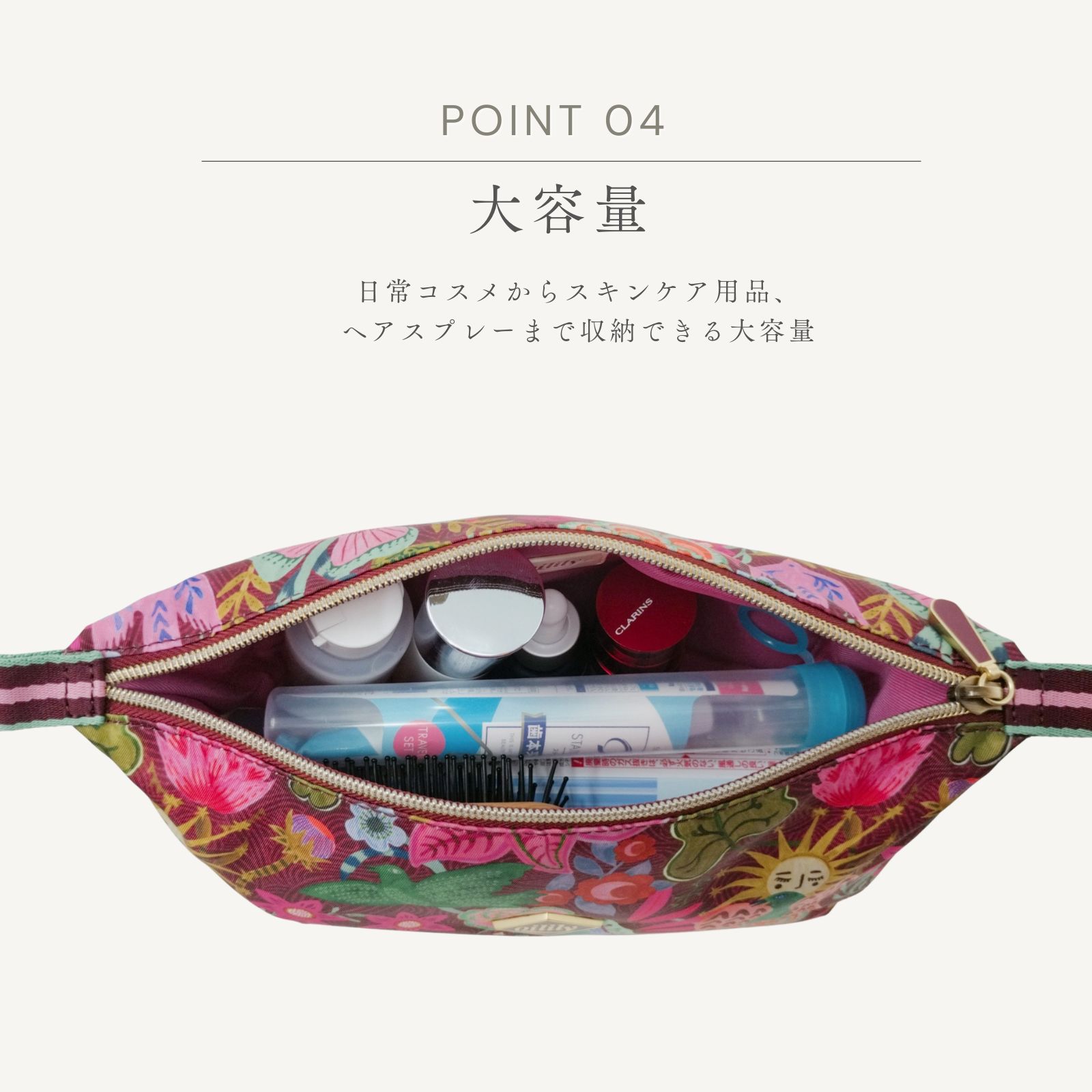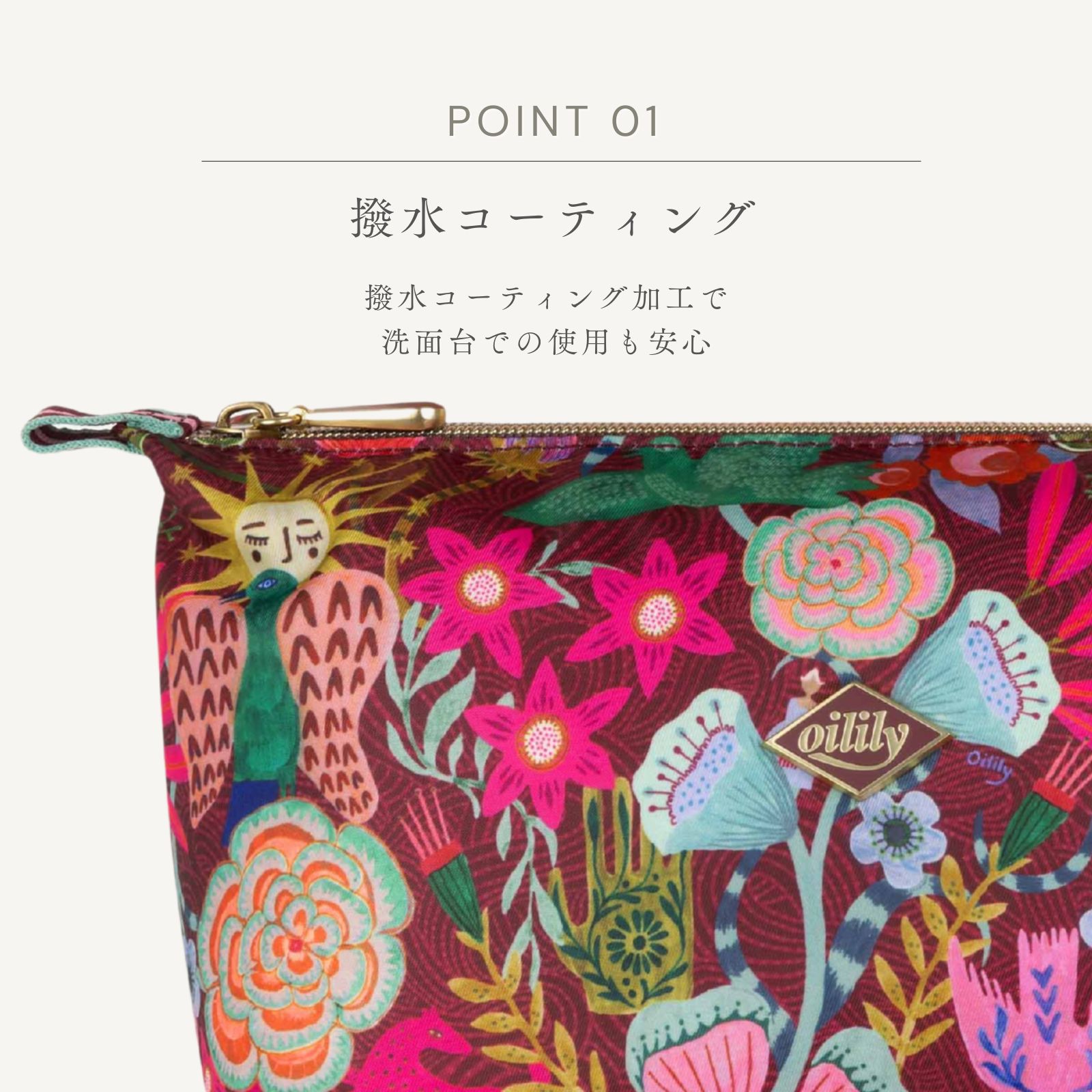 マチがしっかりあるので自立するのがうれしいですね。コスメ類からスプレーまでたっぷり入る大容量。オムツポーチとしてもお使いいただけます。撥水加工がされていて洗面所でも安心。個性溢れるトレジャープリントで使うたびに気持ちまで華やぎます。