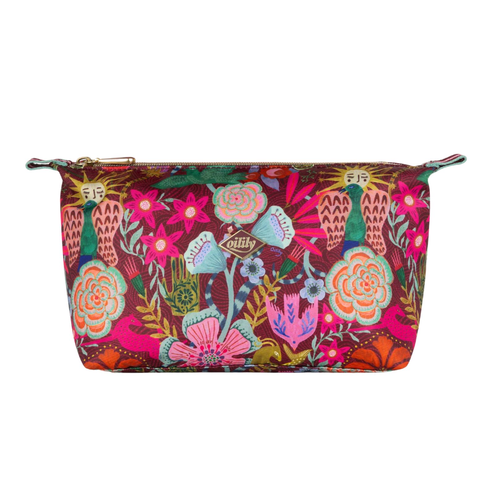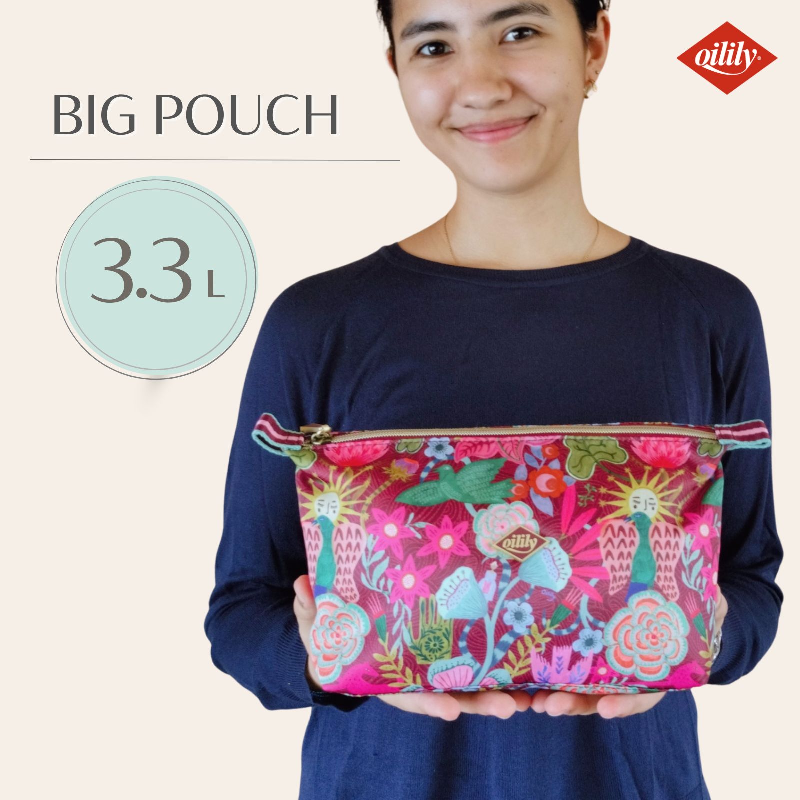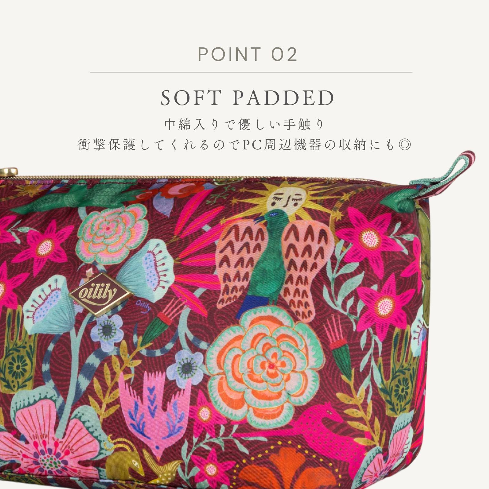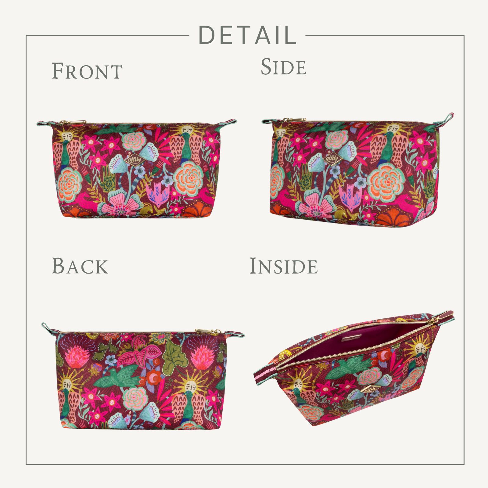 マチがしっかりあるので自立するのがうれしいですね。コスメ類からスプレーまでたっぷり入る大容量。オムツポーチとしてもお使いいただけます。撥水加工がされていて洗面所でも安心。個性溢れるトレジャープリントで使うたびに気持ちまで華やぎます。