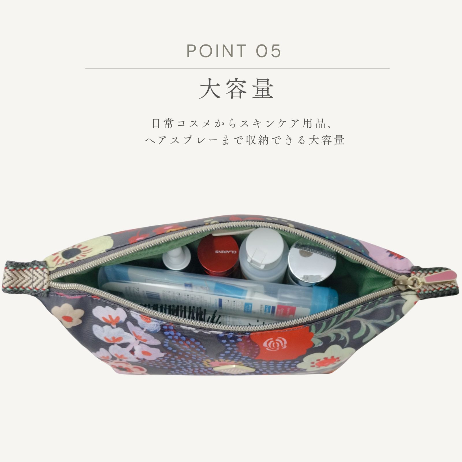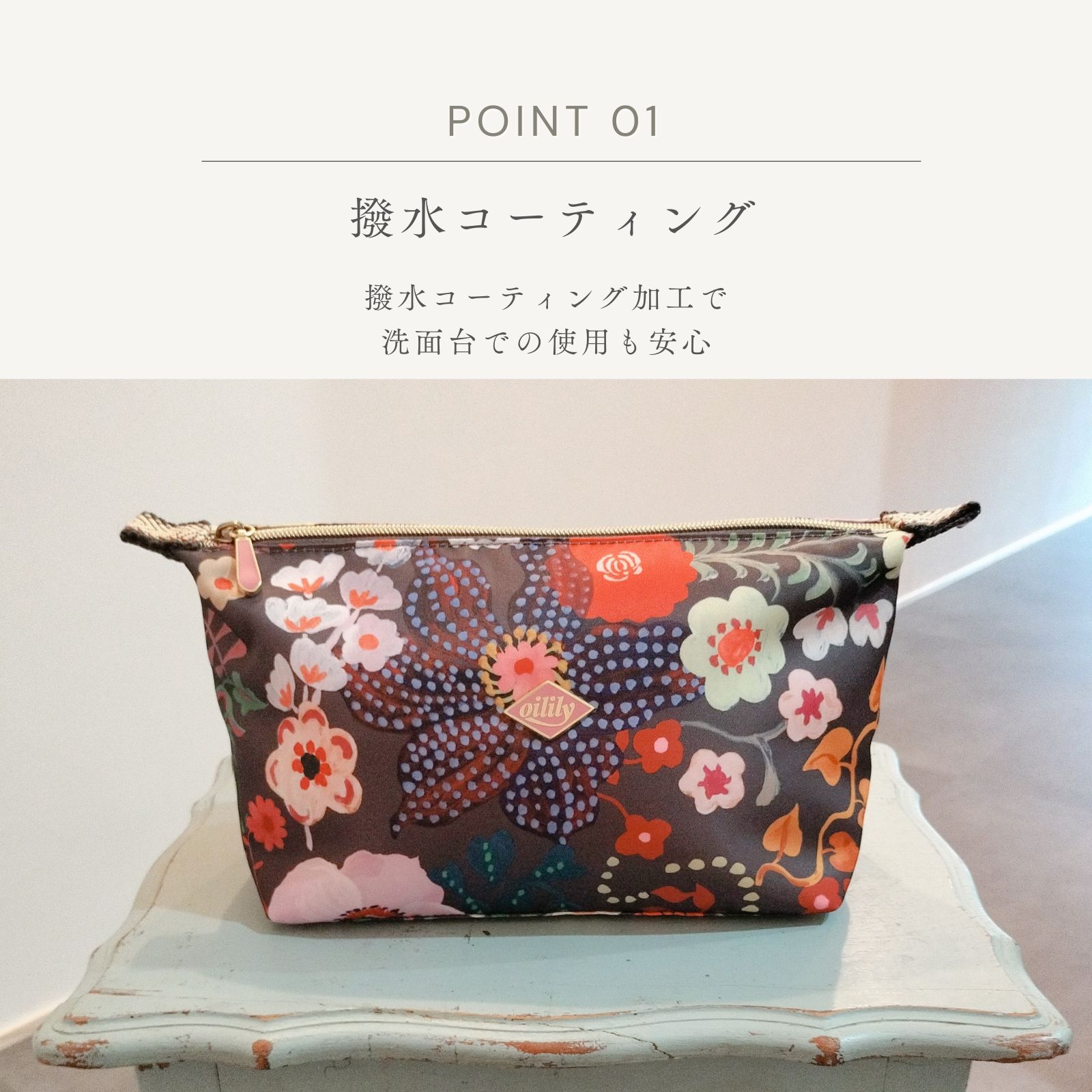 マチがしっかりあるので自立するのがうれしいですね。コスメ類からスプレーまでたっぷり入る大容量。オムツポーチとしてもお使いいただけます。撥水加工がされていて洗面所でも安心。