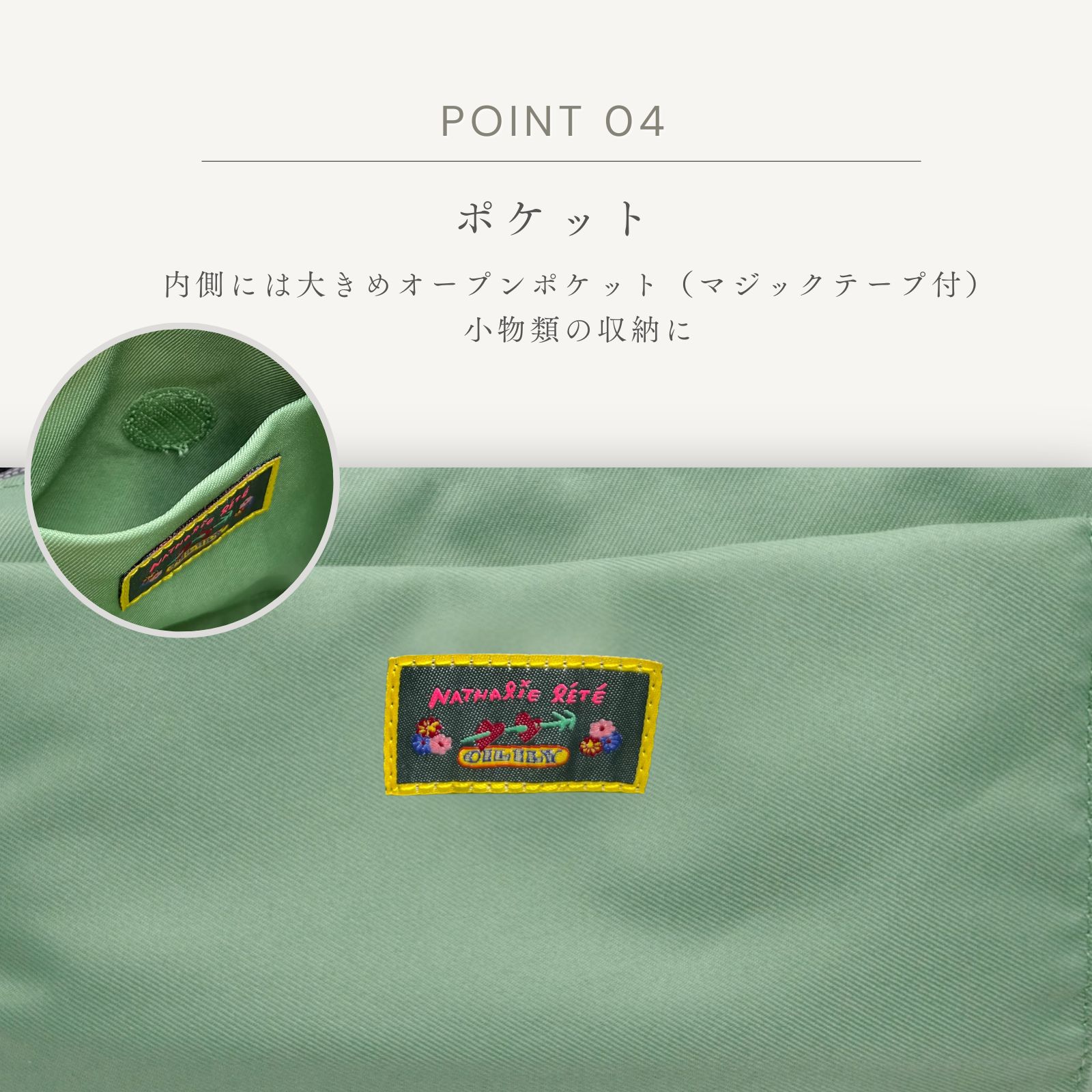 内側にはマジックテープ付ポケットがあるので小物類も整理しやすいです。