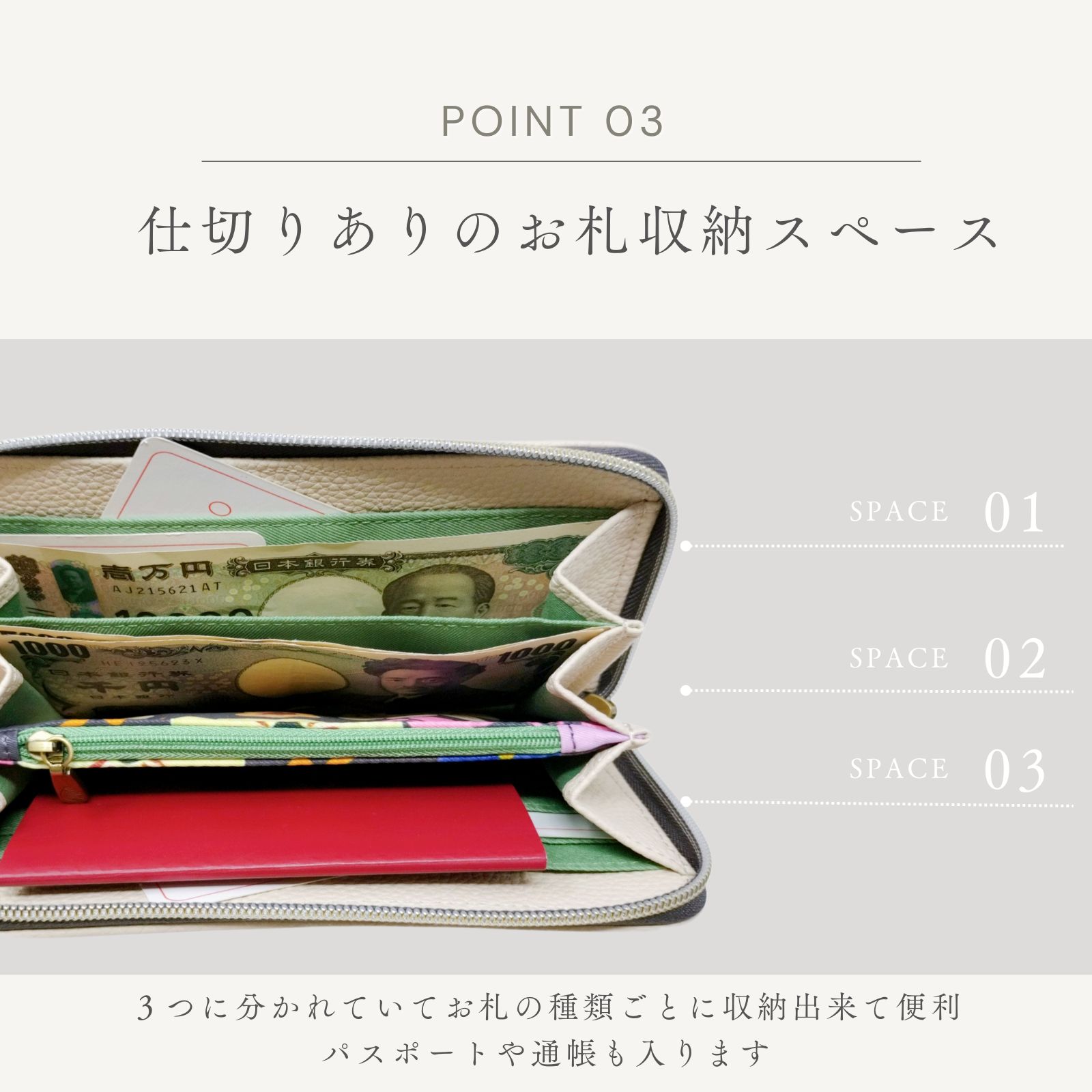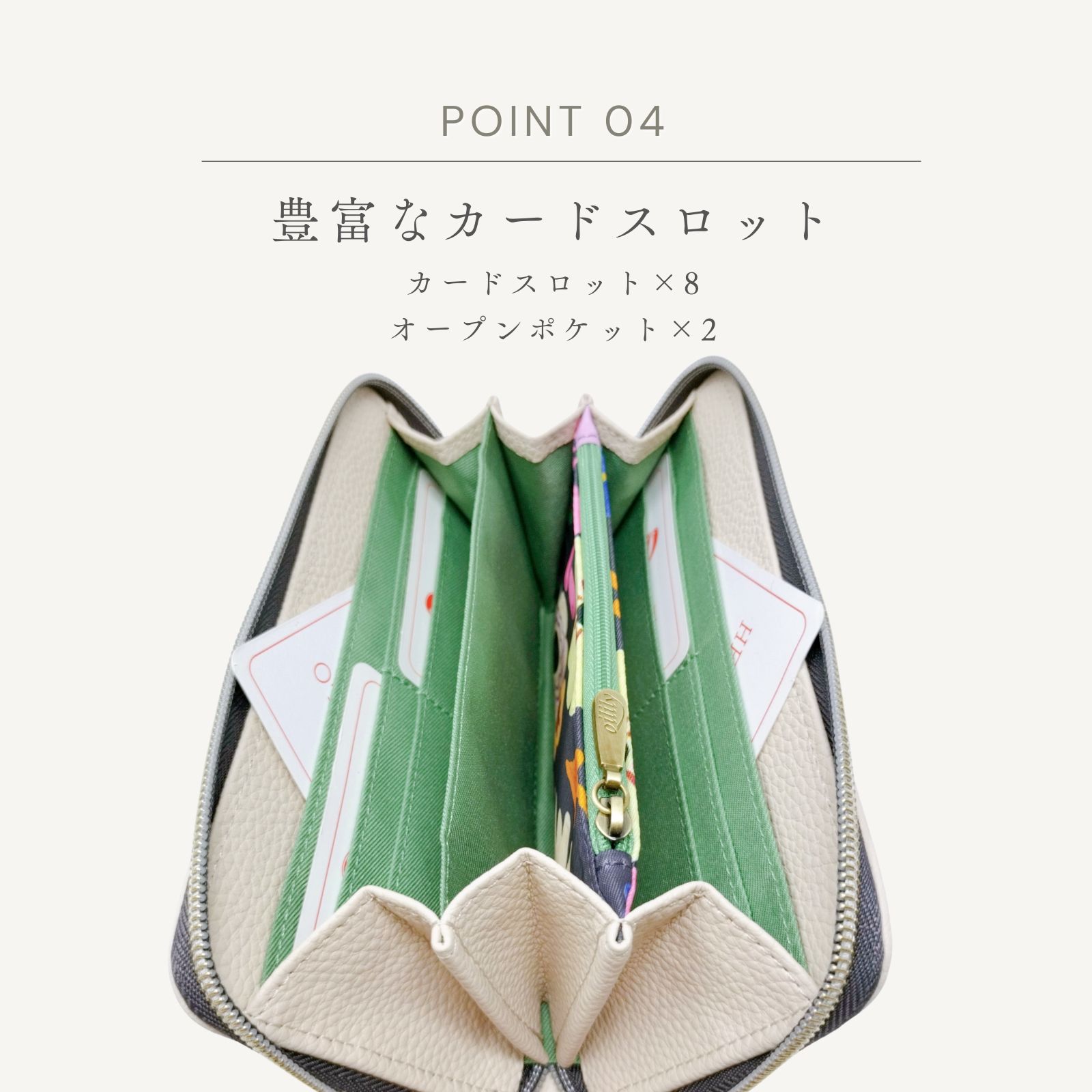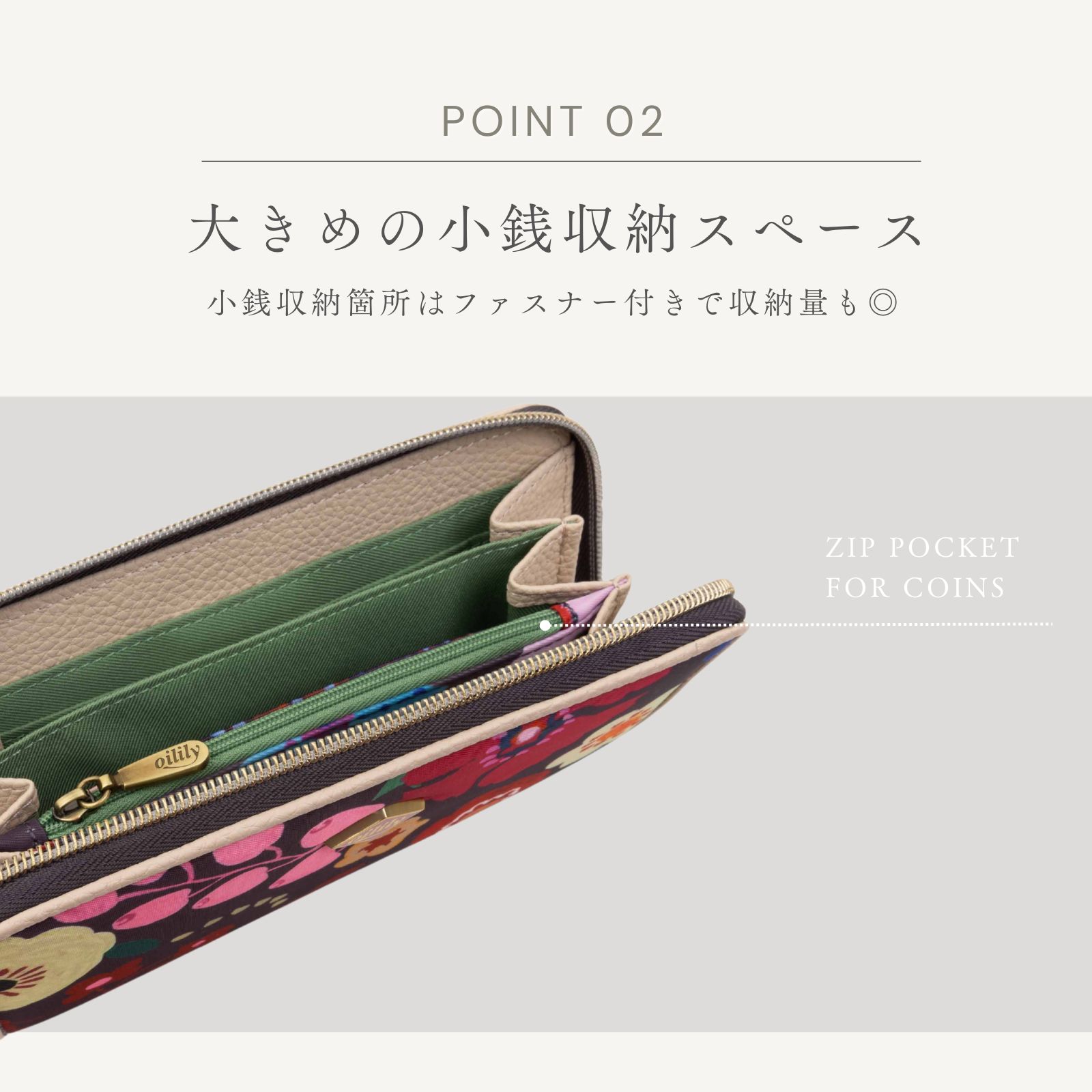 中は3つに分かれていて、お札を用途別に入れることも可能。中央の小銭入れは、ファスナー付き。 この部分に同じフラワープリントでアクセントを付けているのがさすがオイリリーですね! カードを入れる部分は2か所あり、合計8枚とたっぷり収納。さらに通帳やパスポートも入る抜群の収納力で重宝します。 キャッシュレスが進んでもお札をきれいにそのまま収納できる長財布は重宝します裁断位置により柄の出方が異なります。柄はお選びいただけませんのでご了承くださいませ。