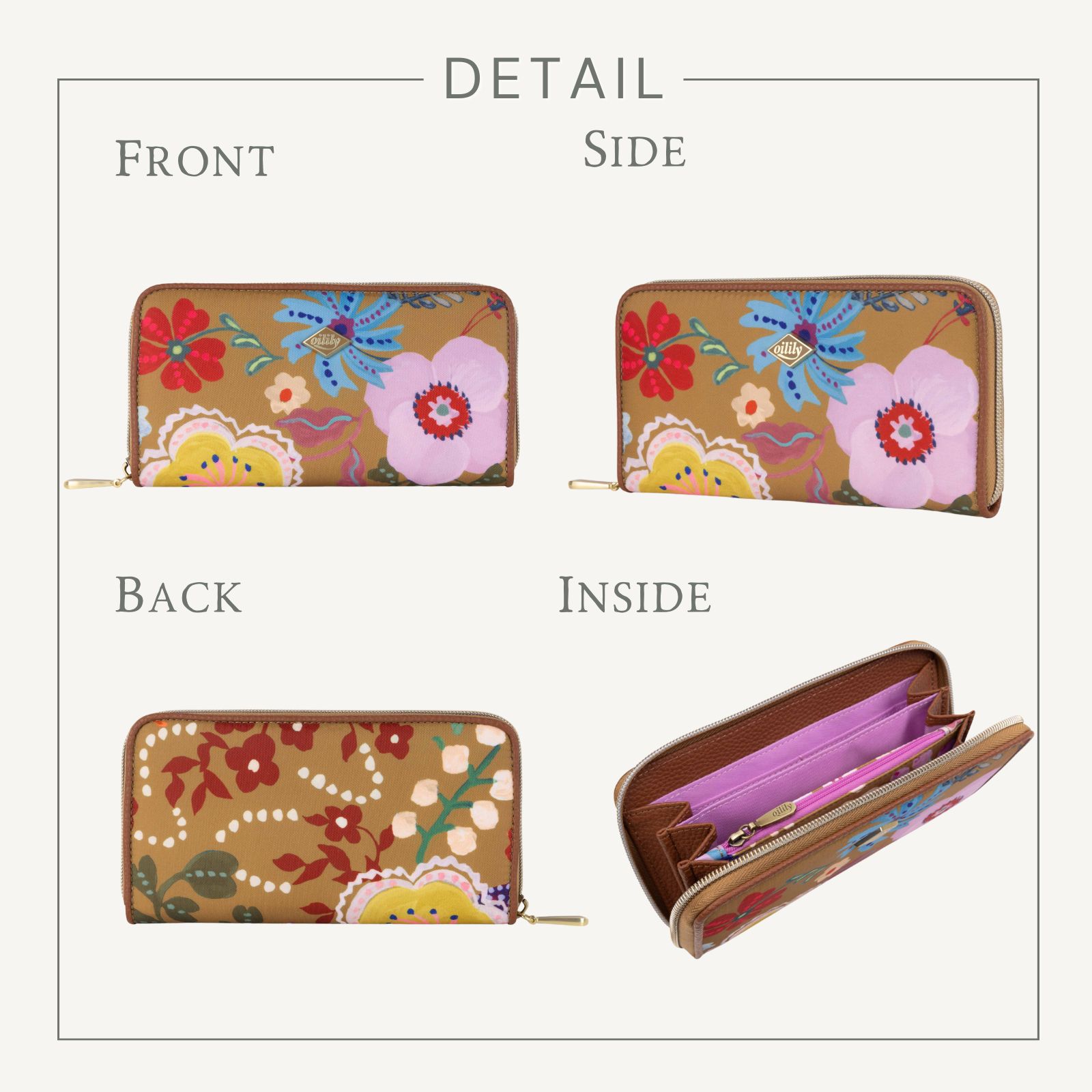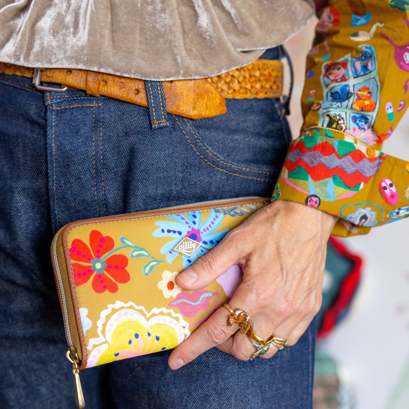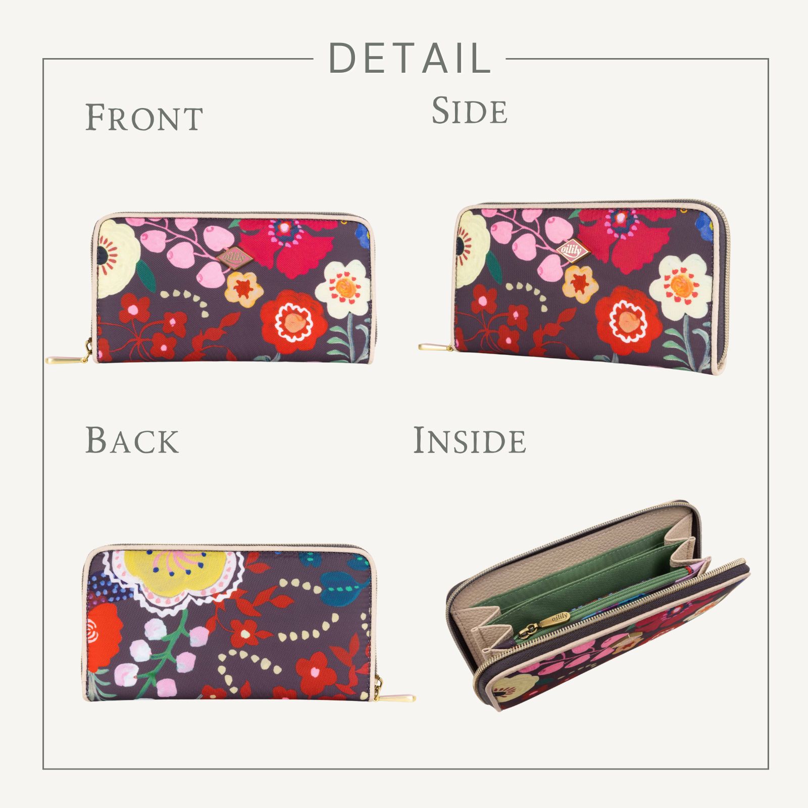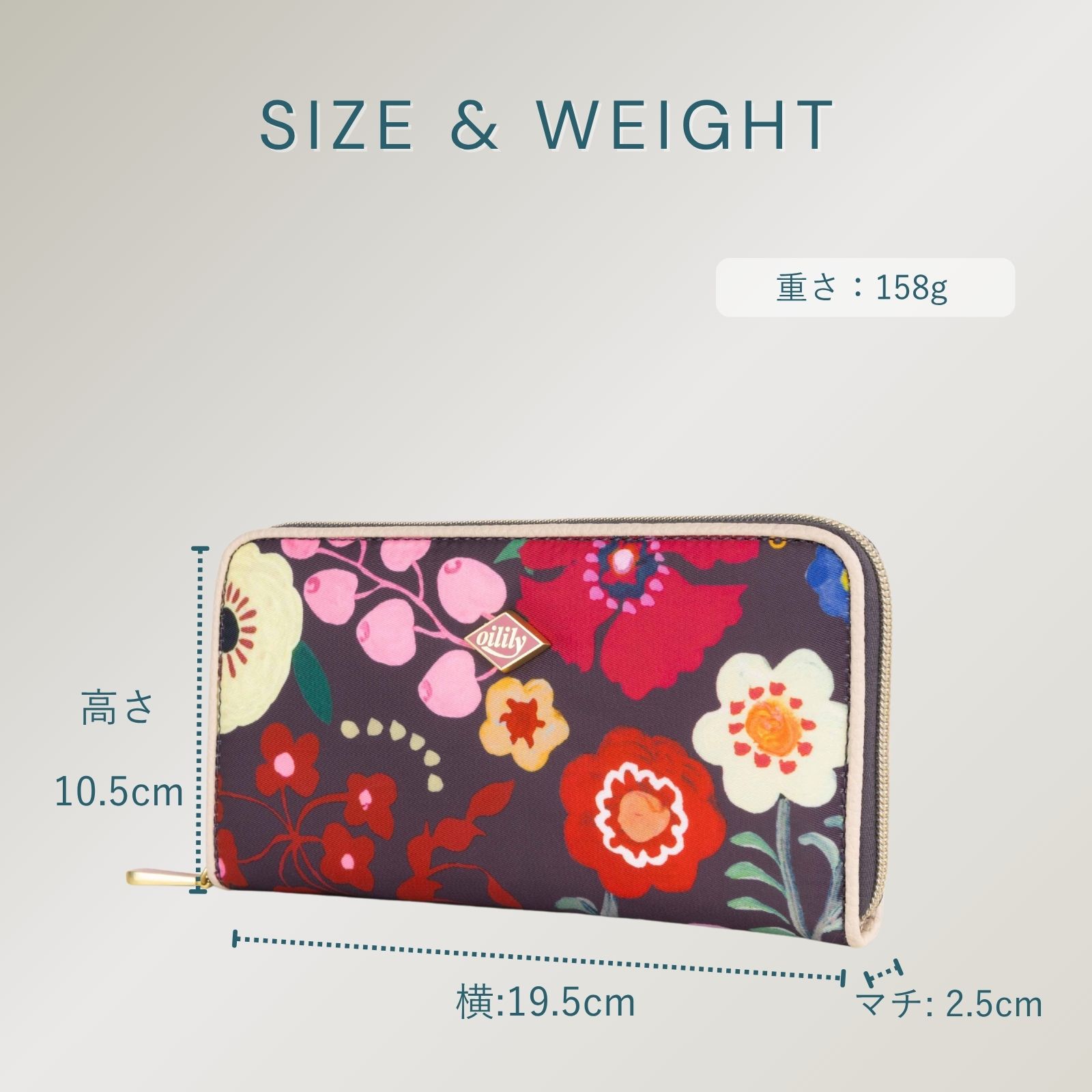 中は3つに分かれていて、お札を用途別に入れることも可能。中央の小銭入れは、ファスナー付き。 この部分に同じフラワープリントでアクセントを付けているのがさすがオイリリーですね! カードを入れる部分は2か所あり、合計8枚とたっぷり収納。さらに通帳やパスポートも入る抜群の収納力で重宝します。 キャッシュレスが進んでもお札をきれいにそのまま収納できる長財布は重宝します裁断位置により柄の出方が異なります。柄はお選びいただけませんのでご了承くださいませ。