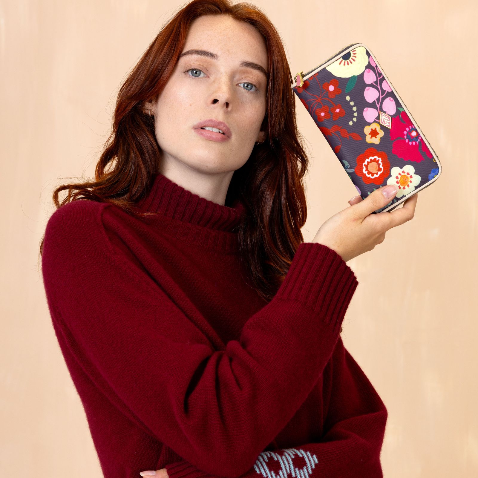 【oil1621】ナタリーレテ コラボ 長財布 ラウンドファスナー 花柄 ハンドペイント フラワー ネックレスノベルティ付き