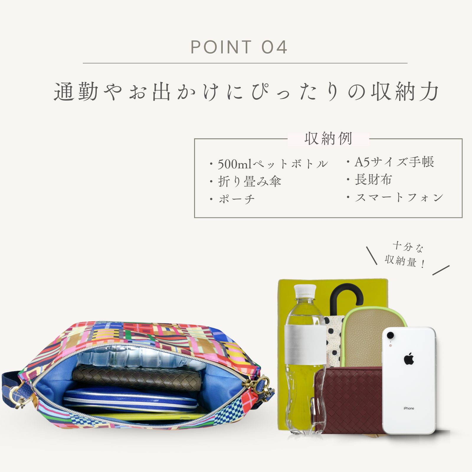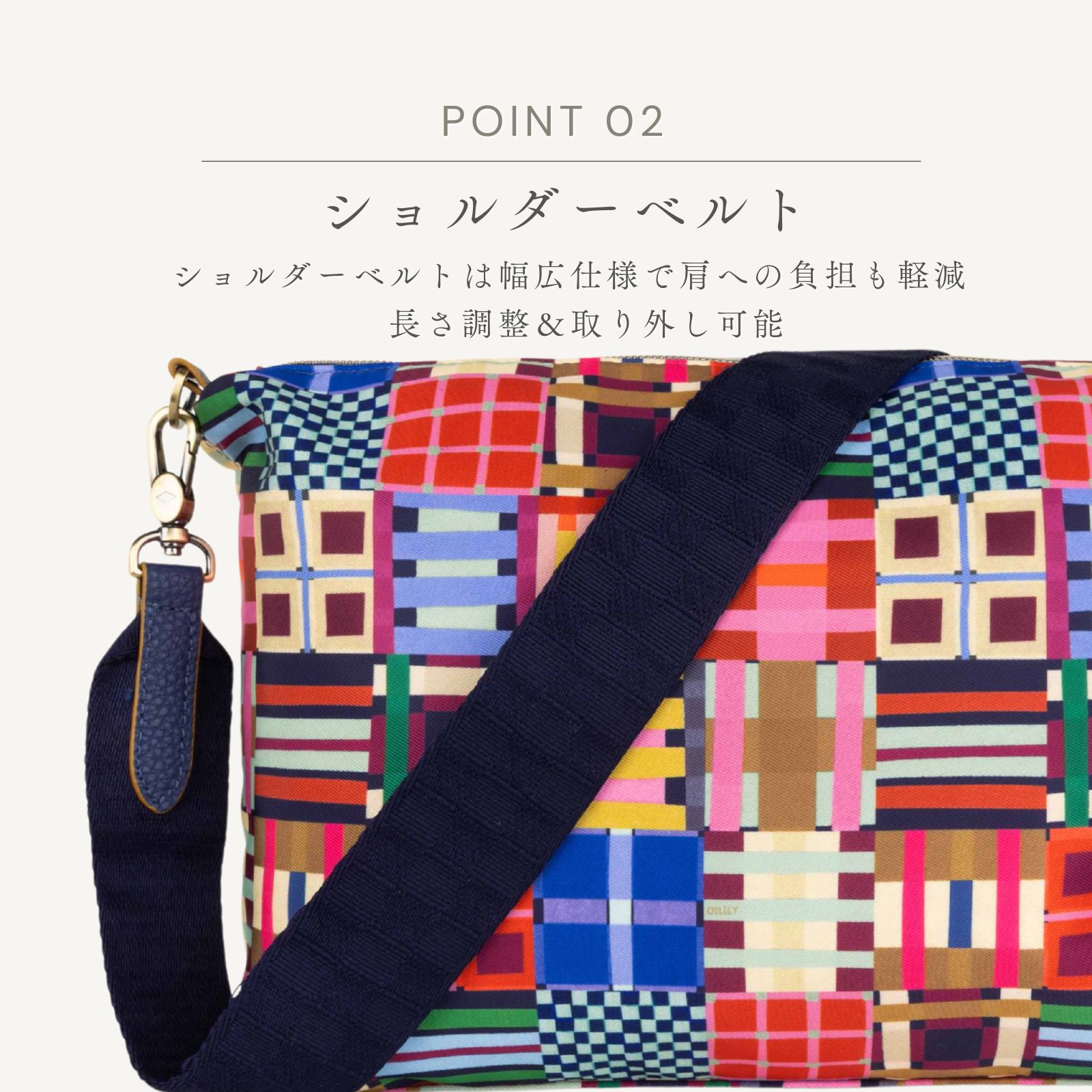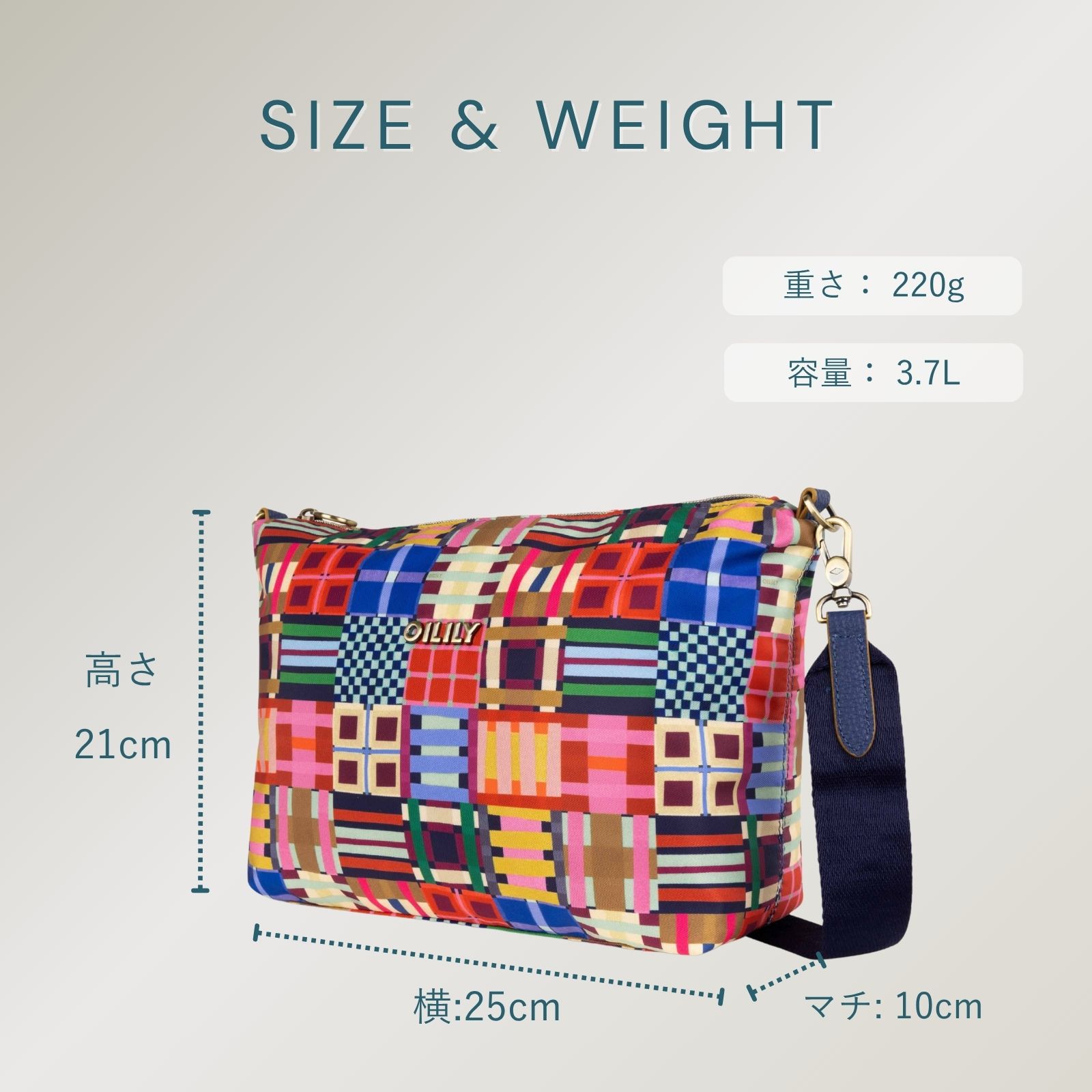 タータンテープが映えるグラフィックプリントのショルダーバッグです。軽くて旅行や日常使いにおすすめです。