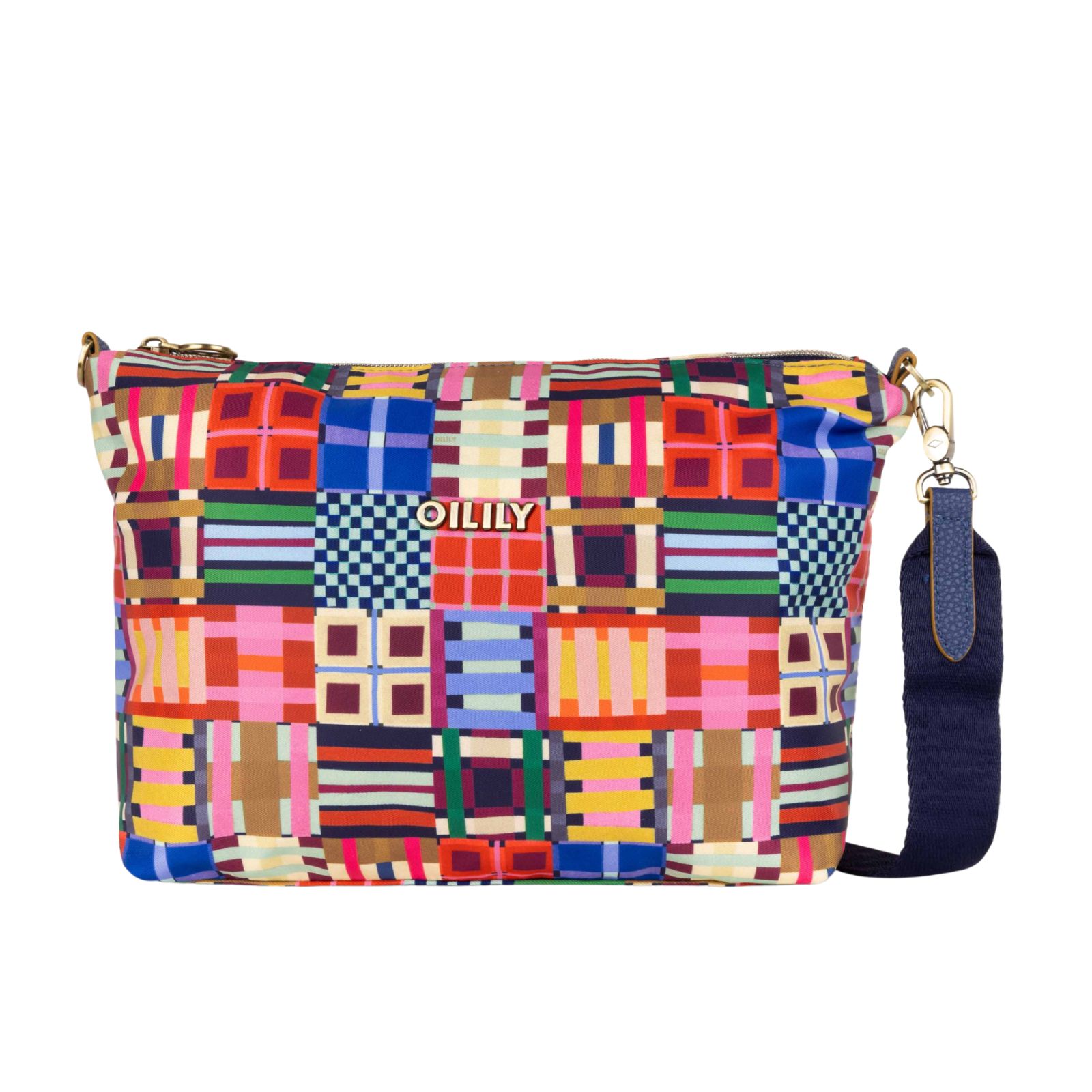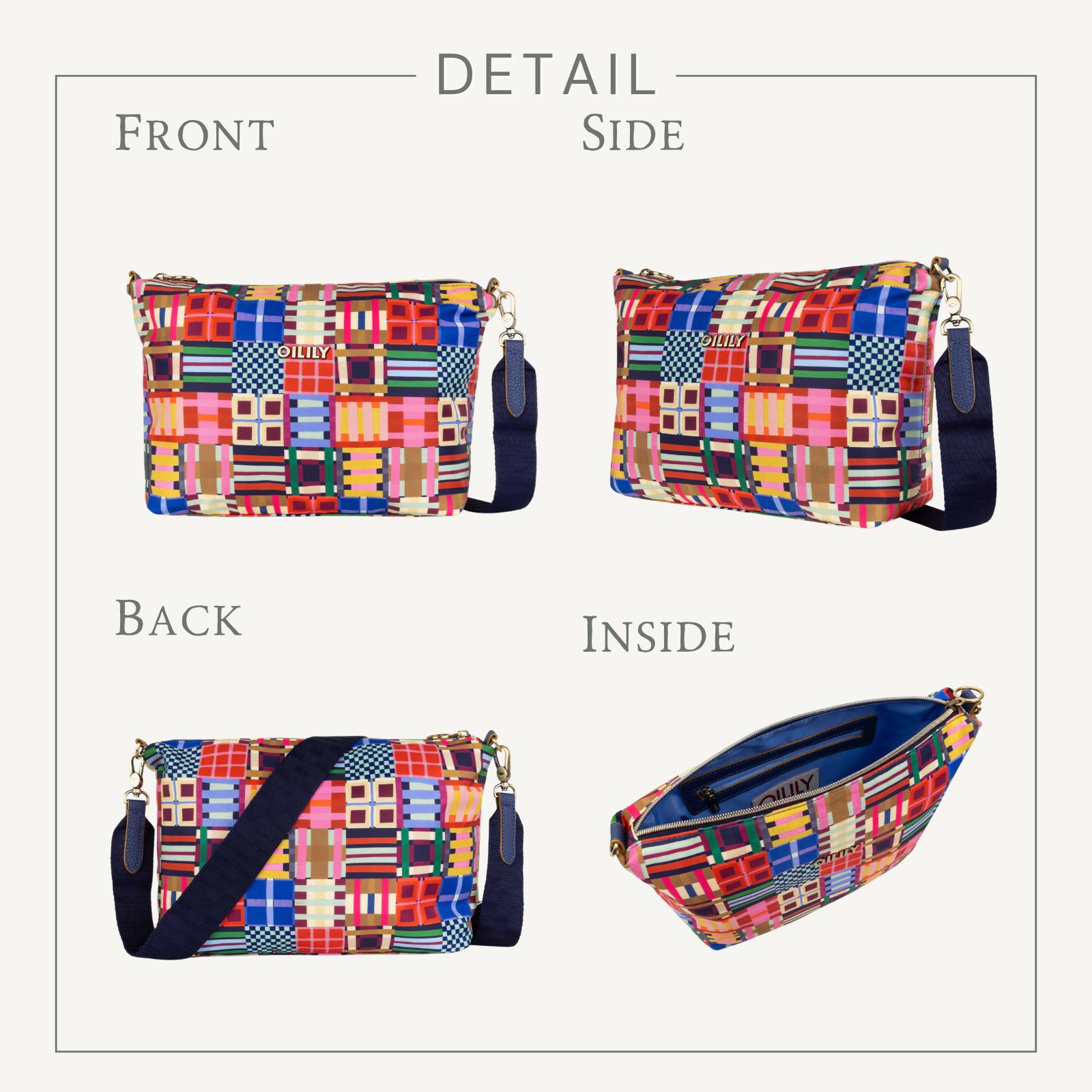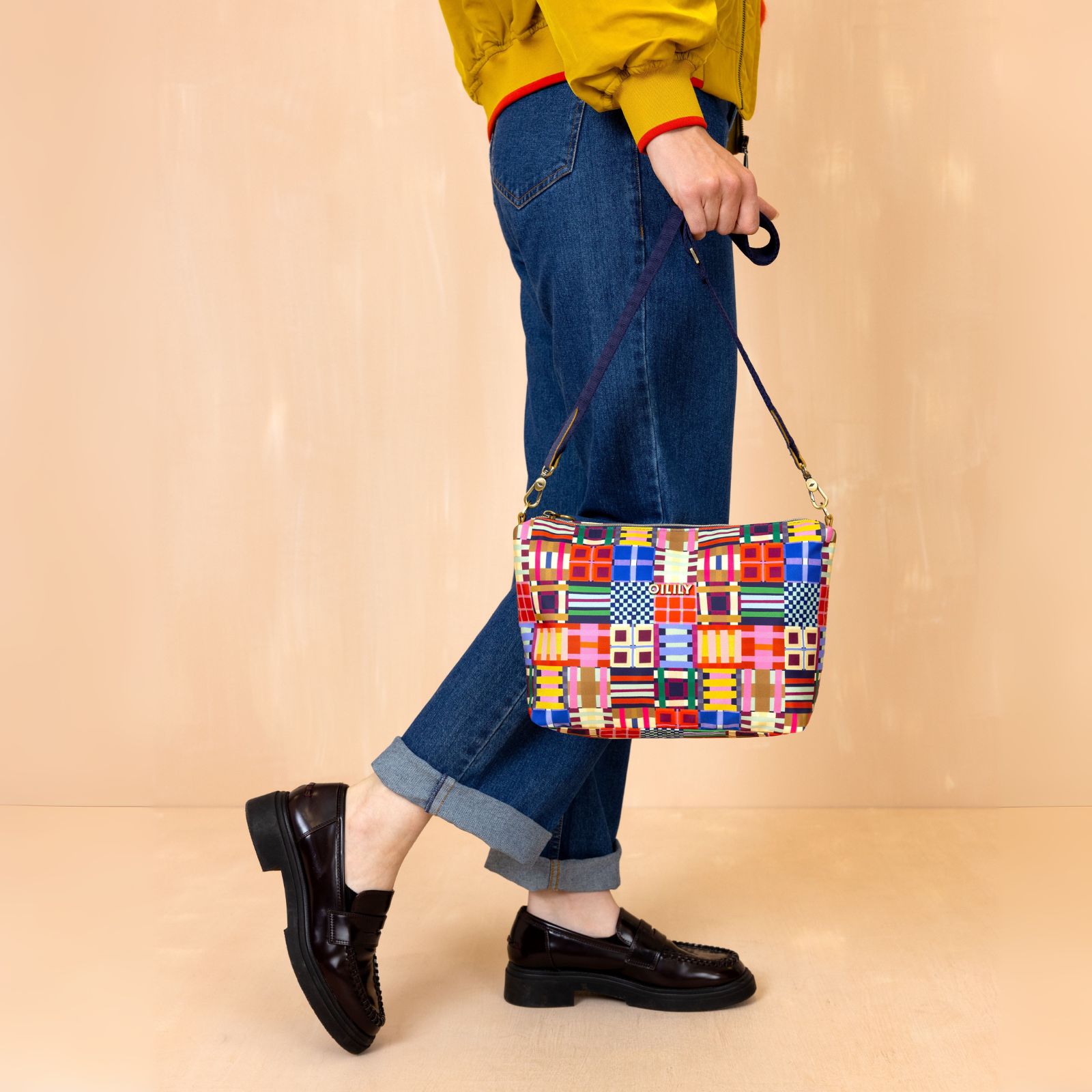 タータンテープが映えるグラフィックプリントのショルダーバッグです。軽くて旅行や日常使いにおすすめです。