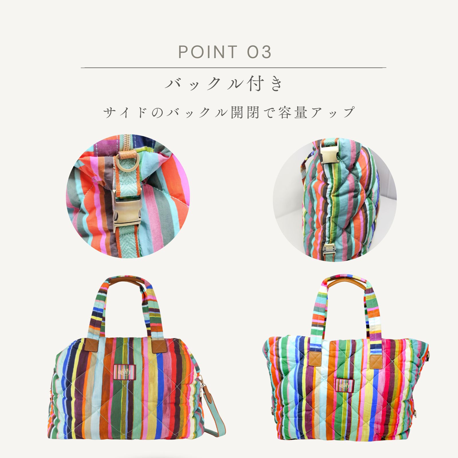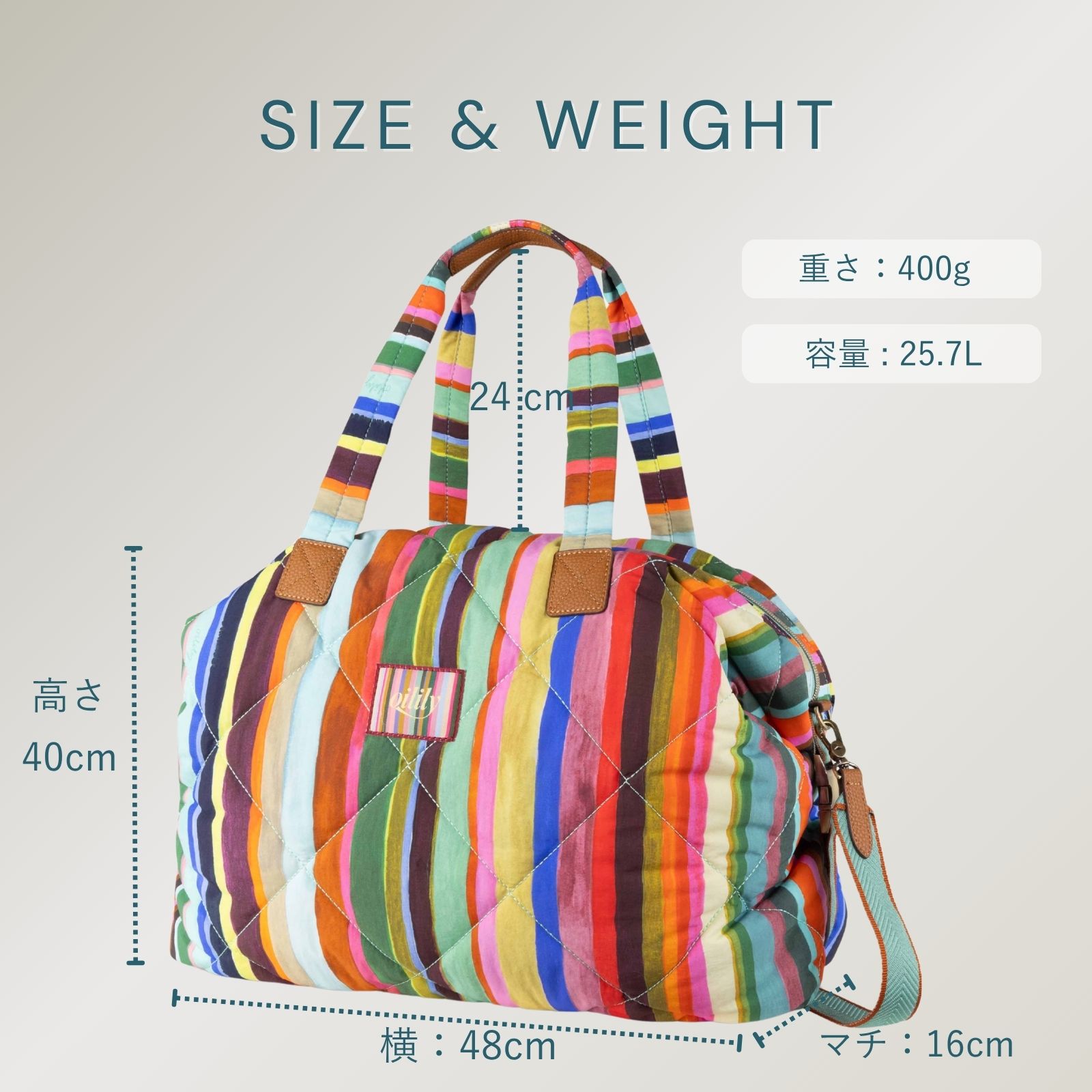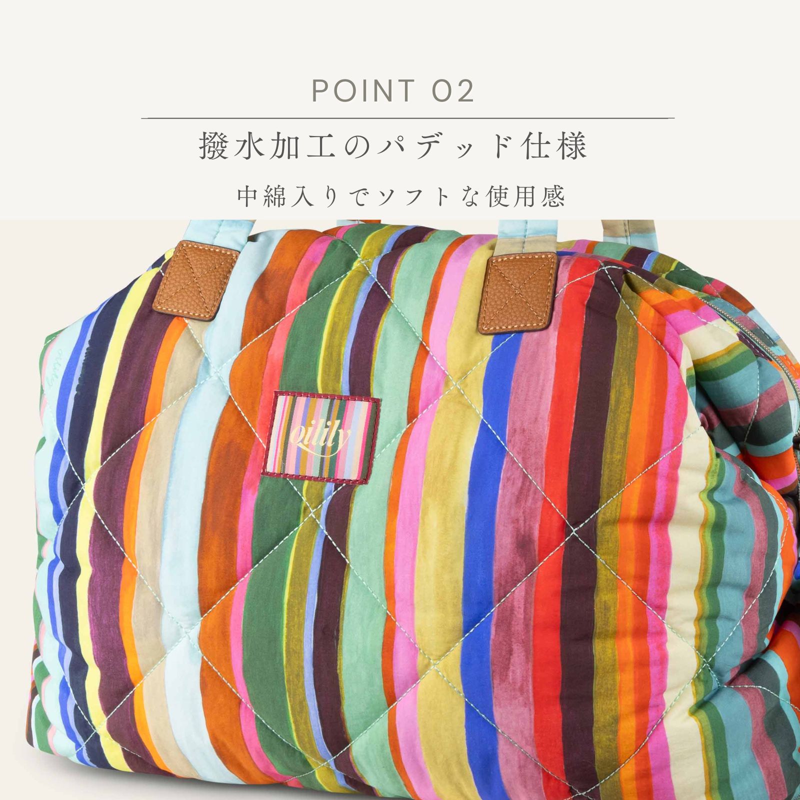 遠くからでも見えるチューリップ畑のストライプと色彩からインスピレーションを得たピエテルネッレのストライププリント。中綿入りで柔らかな使い心地のバッグは、容量も多く、週末旅行やジム通いにもぴったりなサイズです。