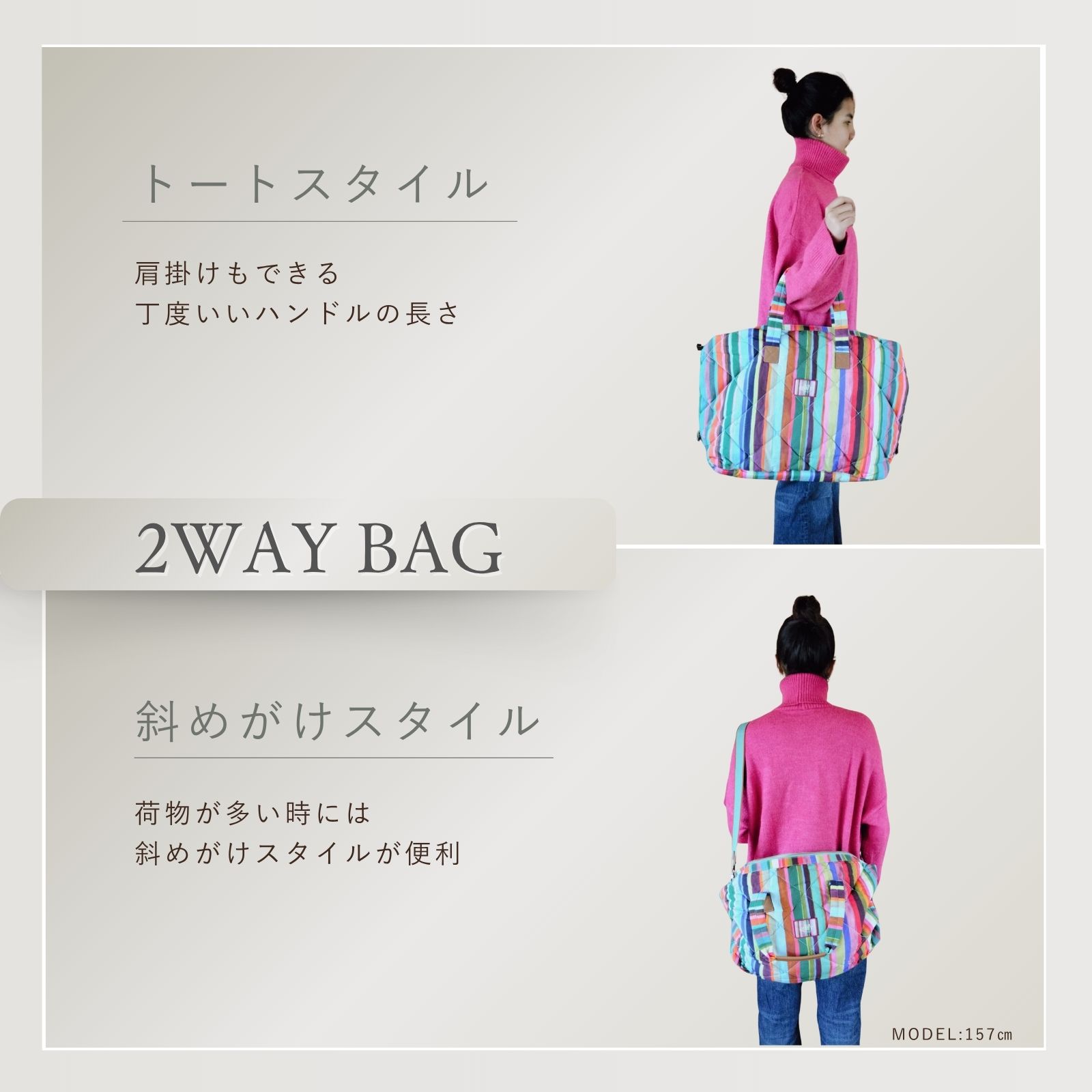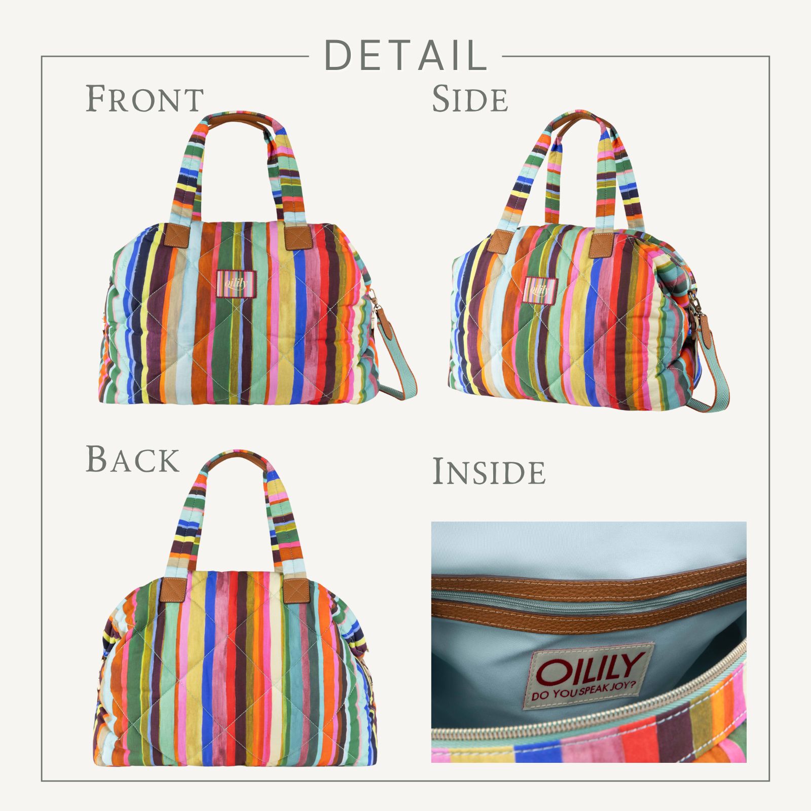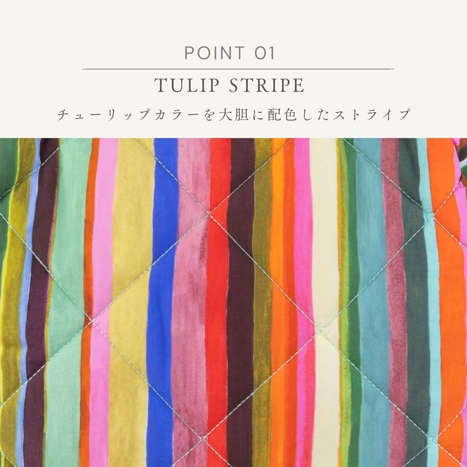 遠くからでも見えるチューリップ畑のストライプと色彩からインスピレーションを得たピエテルネッレのストライププリント。中綿入りで柔らかな使い心地のバッグは、容量も多く、週末旅行やジム通いにもぴったりなサイズです。