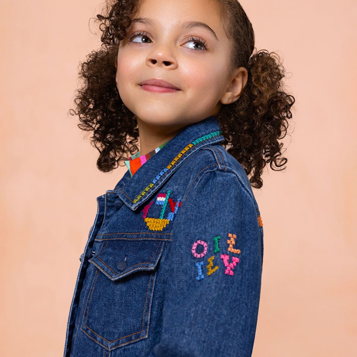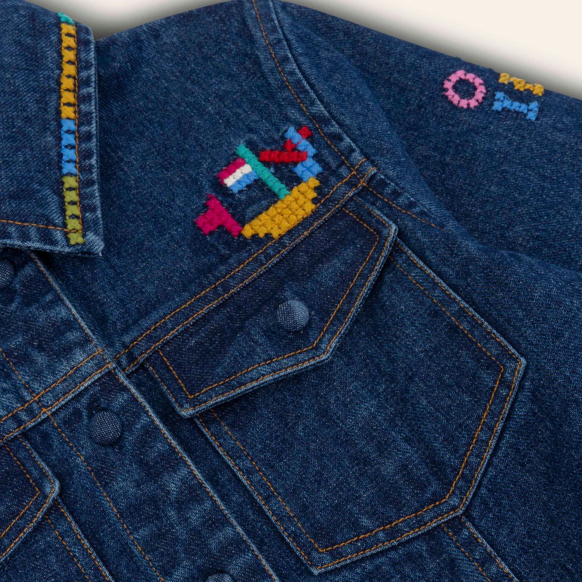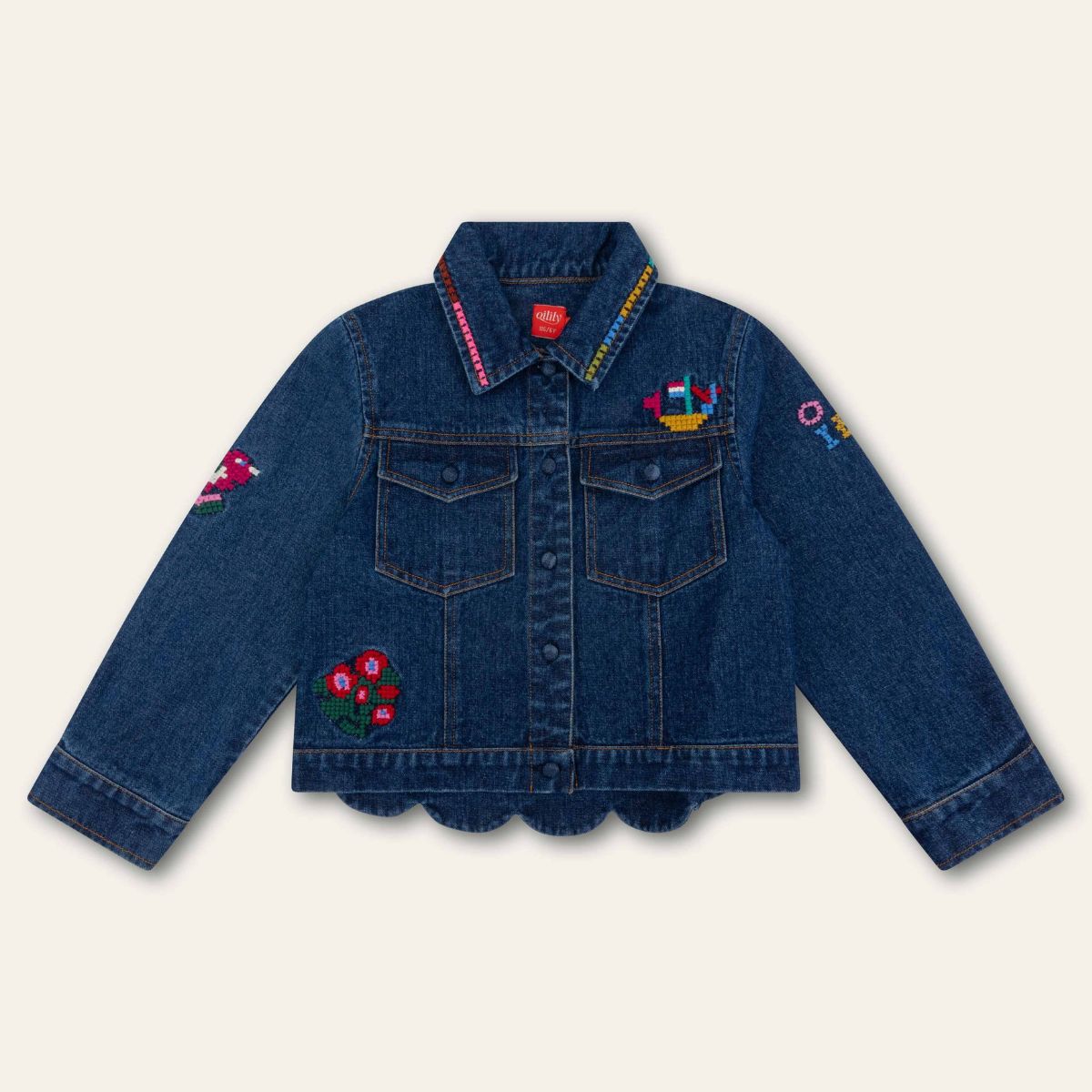 このジーンズジャケットは、目を楽しませる美しいディテールが満載です。裾のスカラップカット、そして中でも特に目を引くのは、民話にインスパイアされた遊び心のある刺繍と楽しい要素が散りばめられています。まさに目を引く一品です。