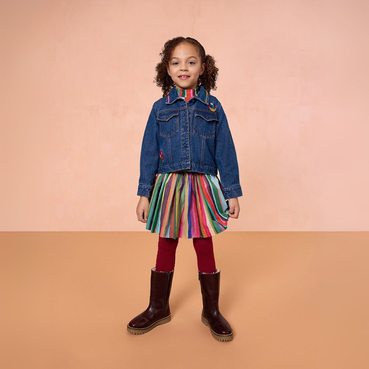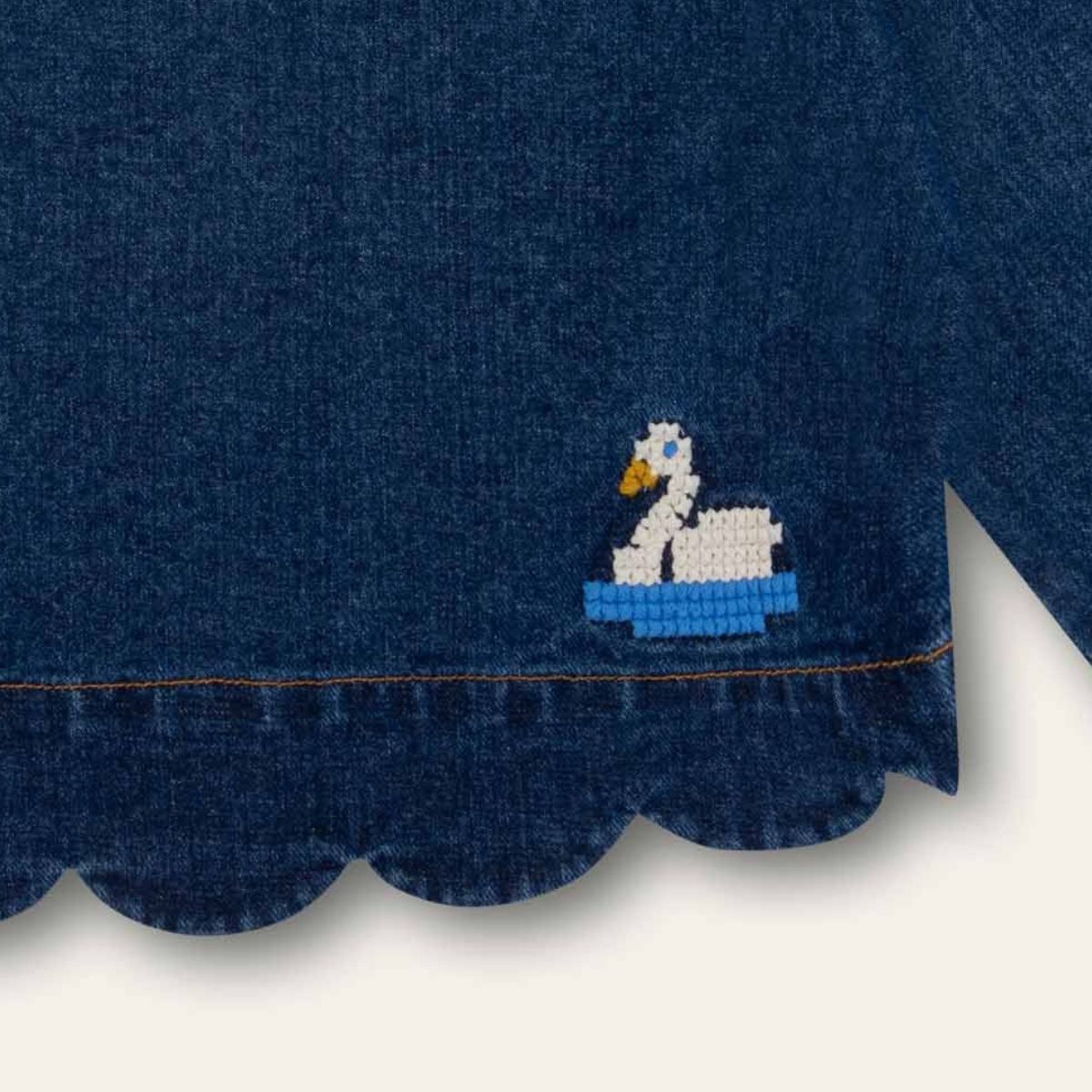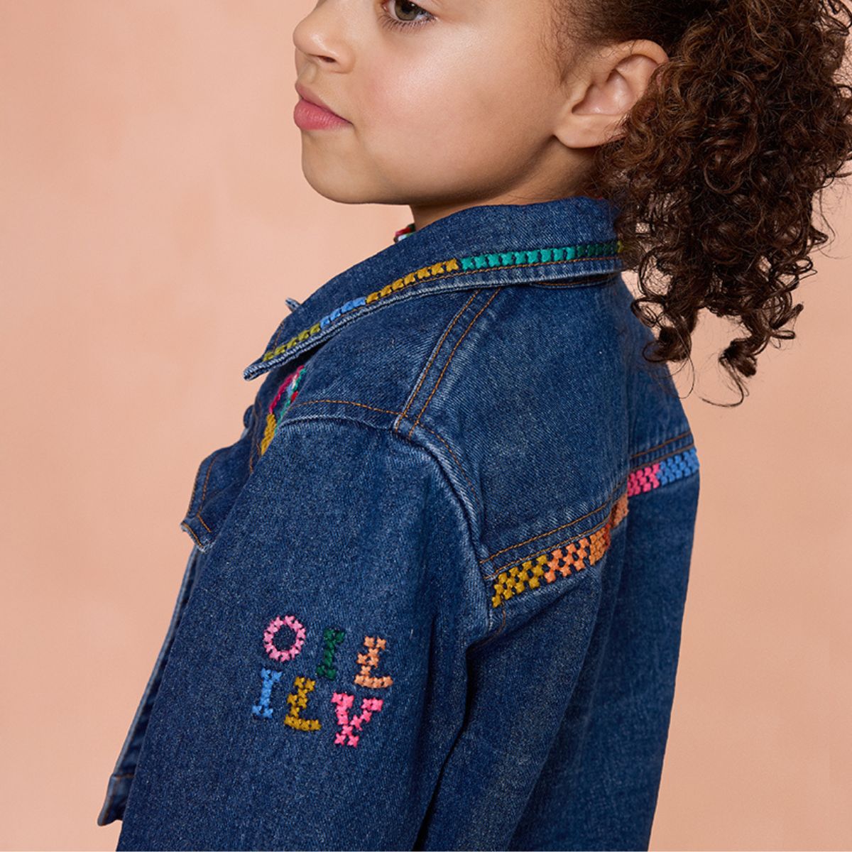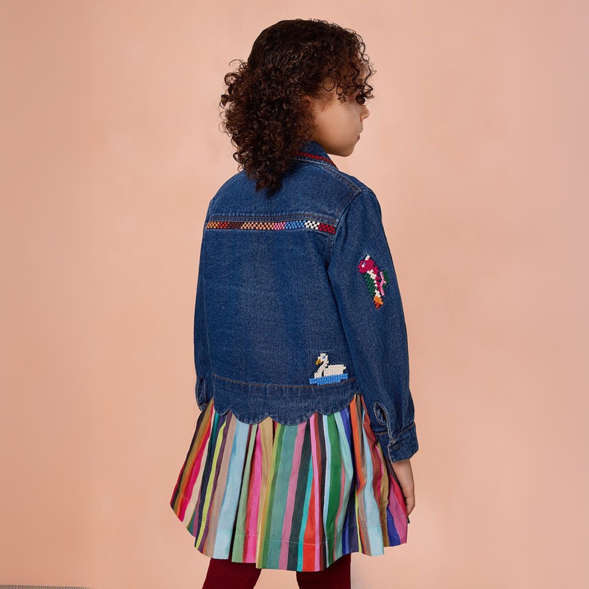 このジーンズジャケットは、目を楽しませる美しいディテールが満載です。裾のスカラップカット、そして中でも特に目を引くのは、民話にインスパイアされた遊び心のある刺繍と楽しい要素が散りばめられています。まさに目を引く一品です。