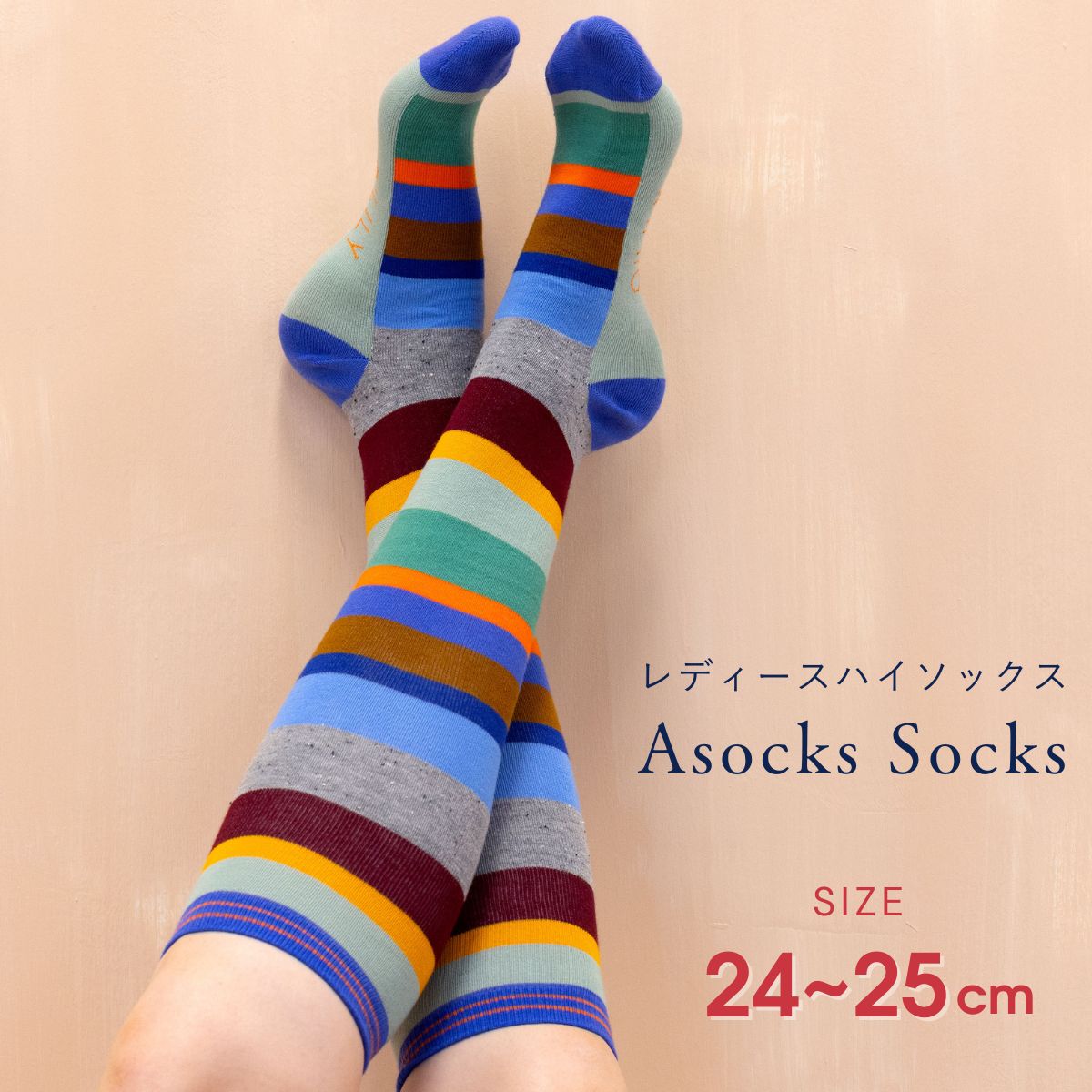 【f25wti9142】 靴下 ソックス ハイソックス ストライプ マルチカラー ボーダー ブルー系【大人サイズ】