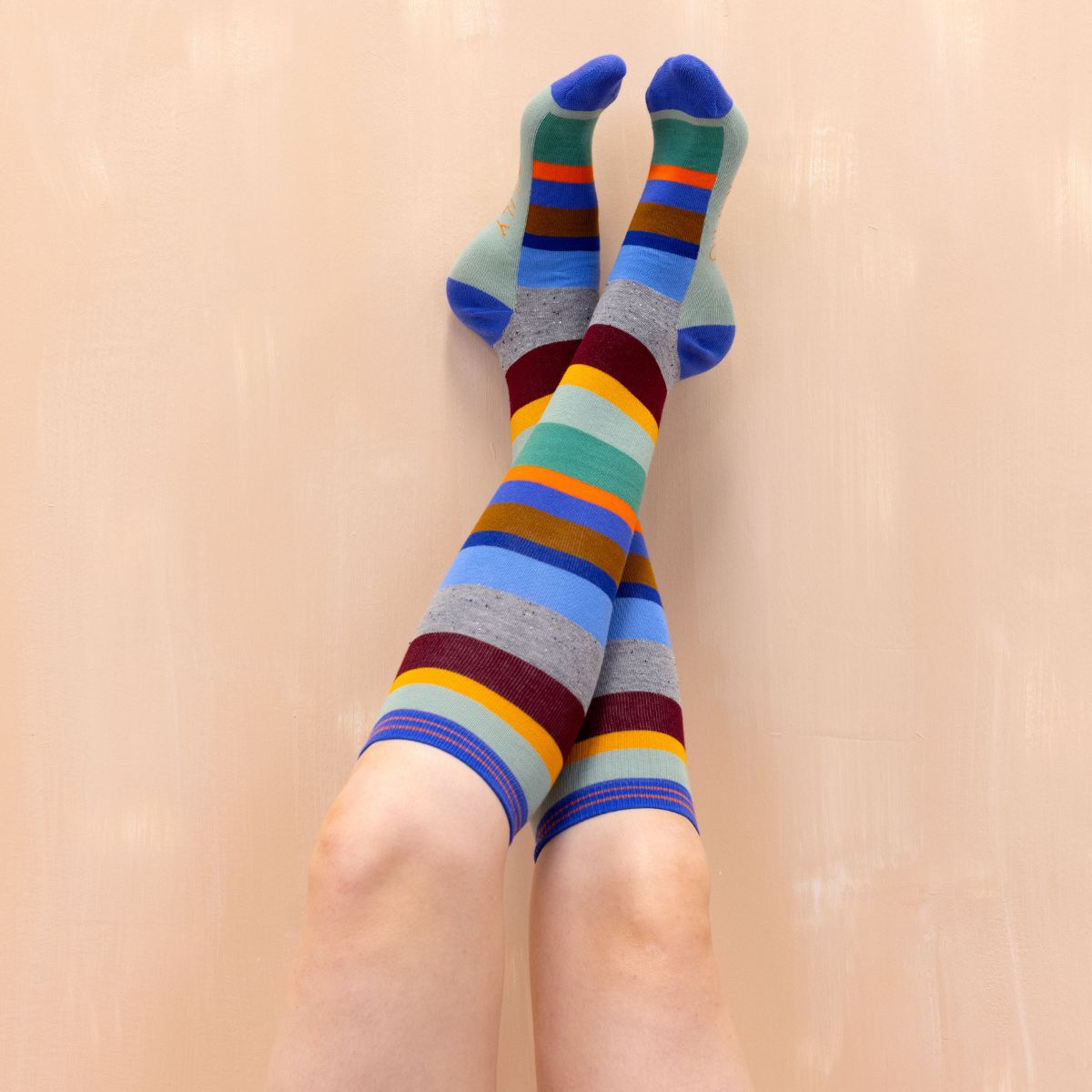 足を暖かくしてくれる素敵なロングソックス。ボーダーやカラーブロッキングの心地よい色合いです。