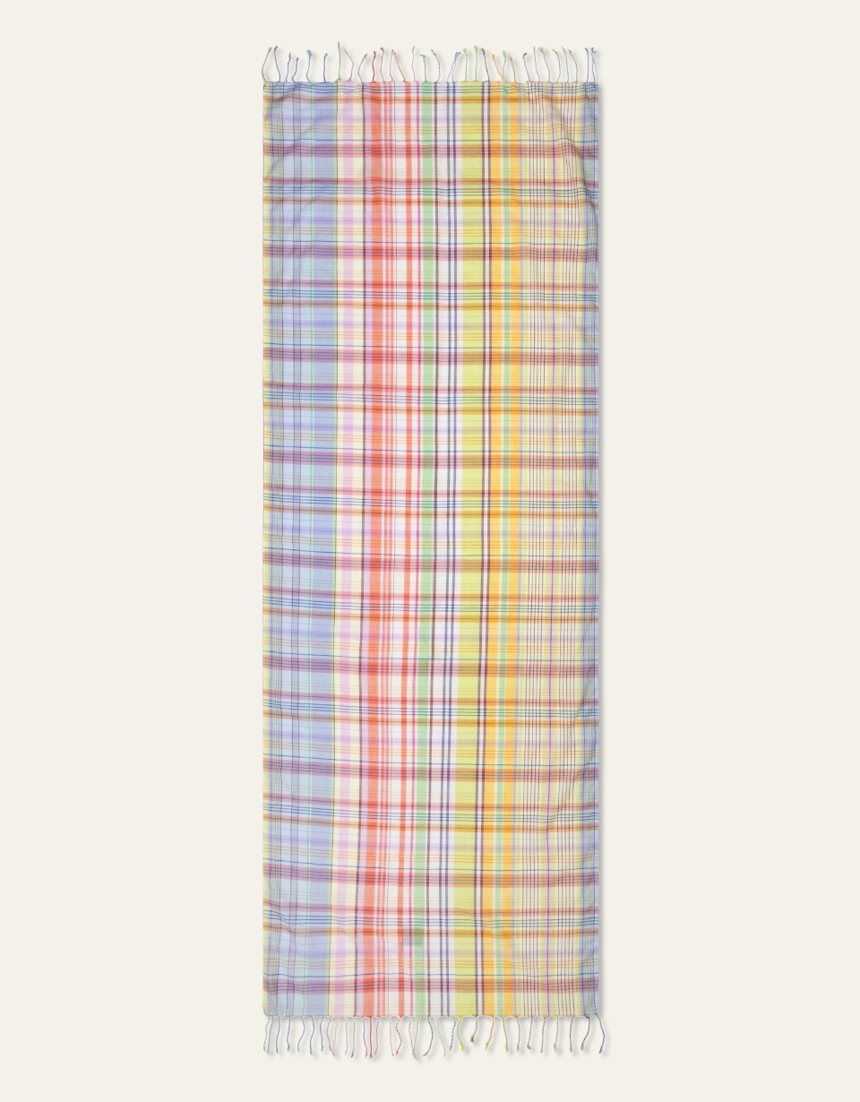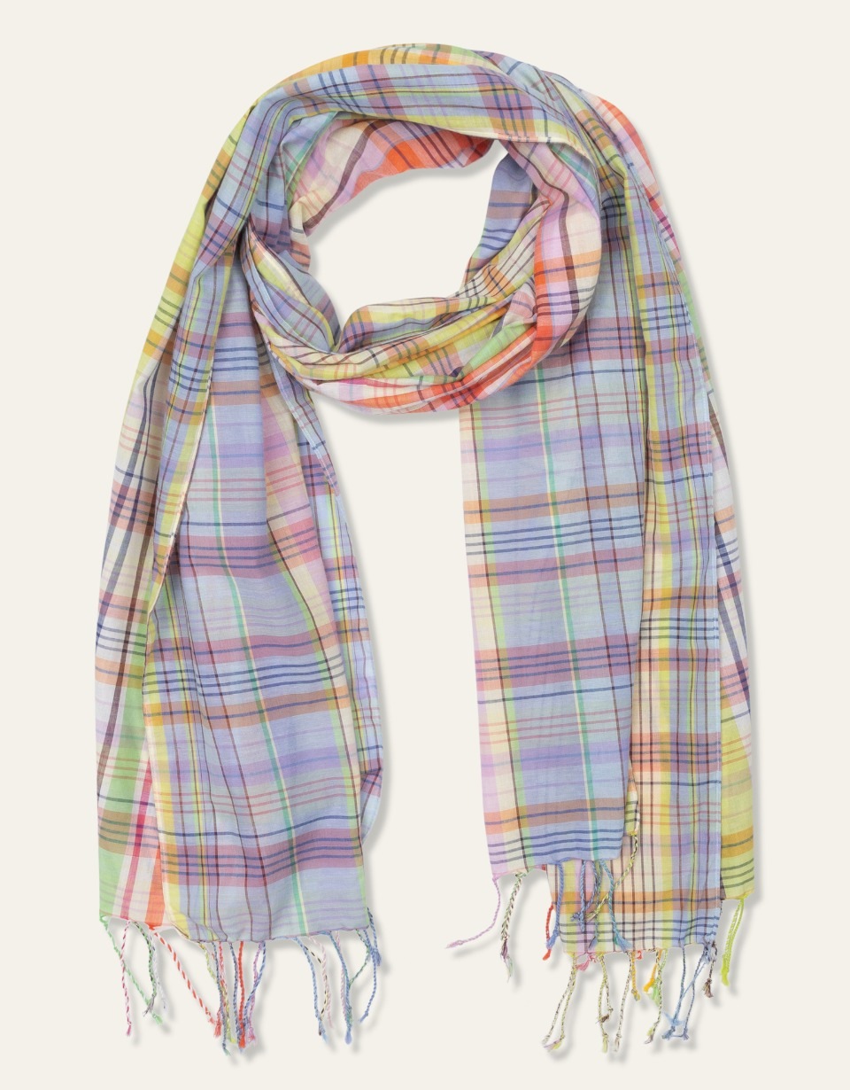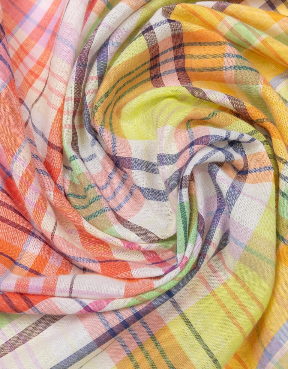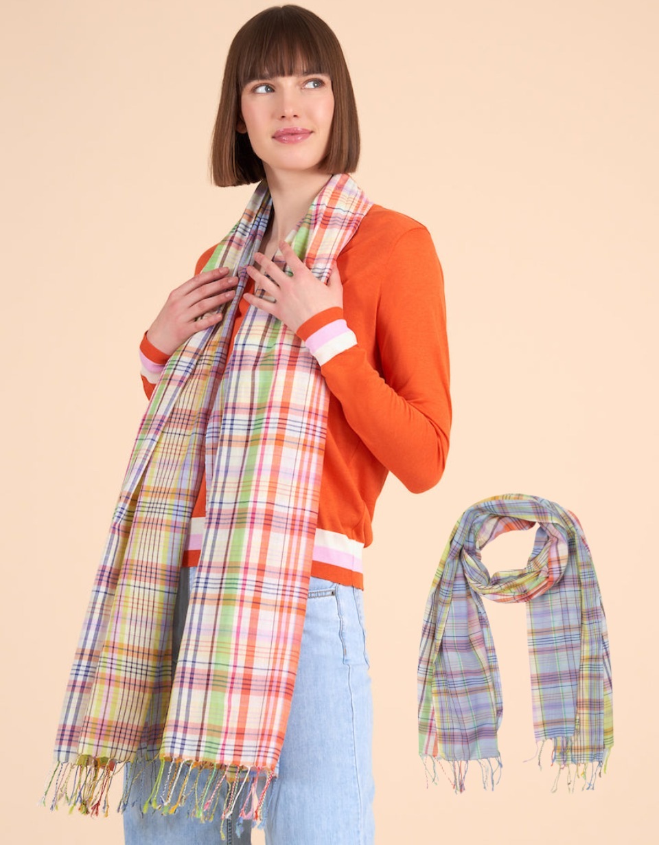 春らしいコットンのストール。カラフルな色合いにクラシカルなチェック柄が印象的な大判タイプ。