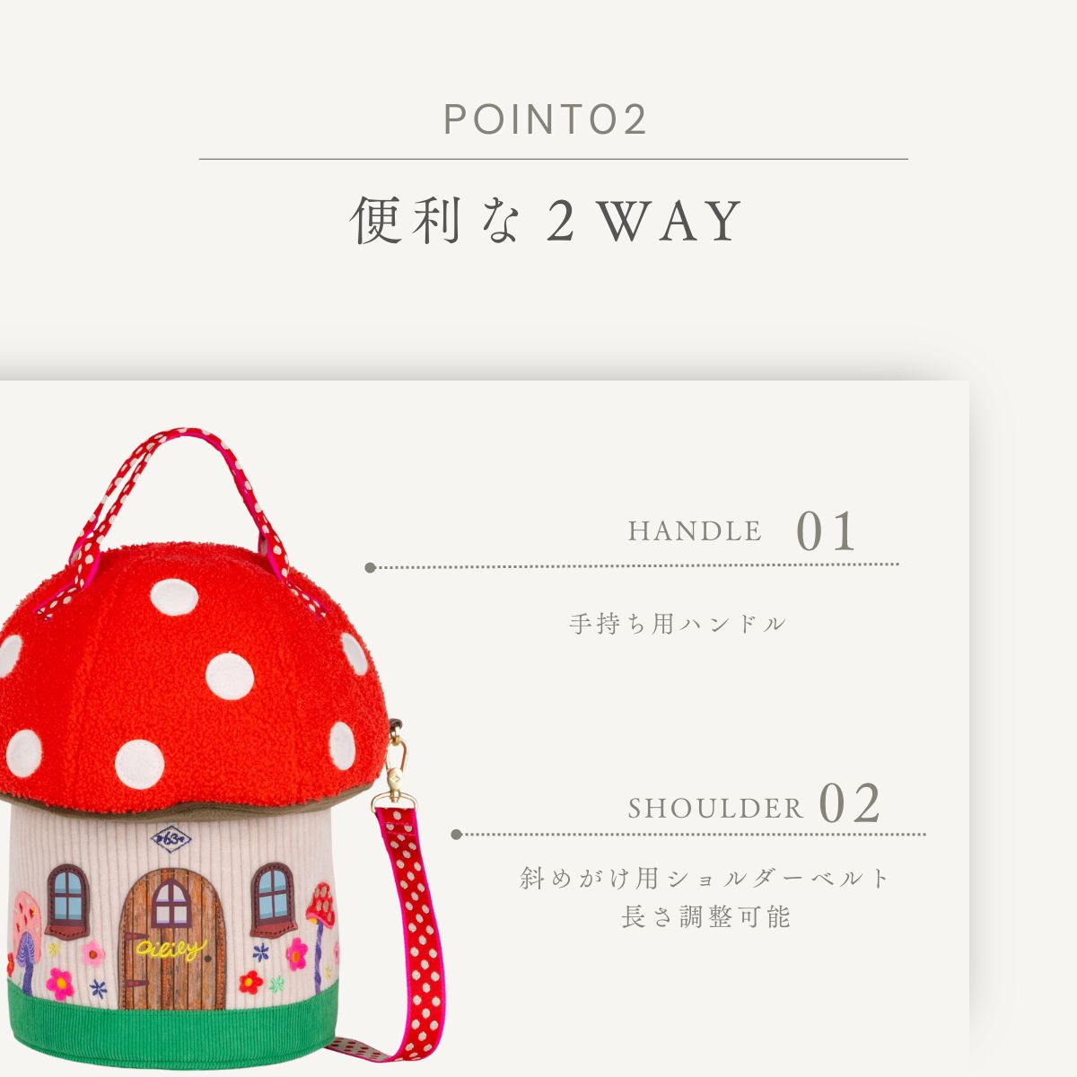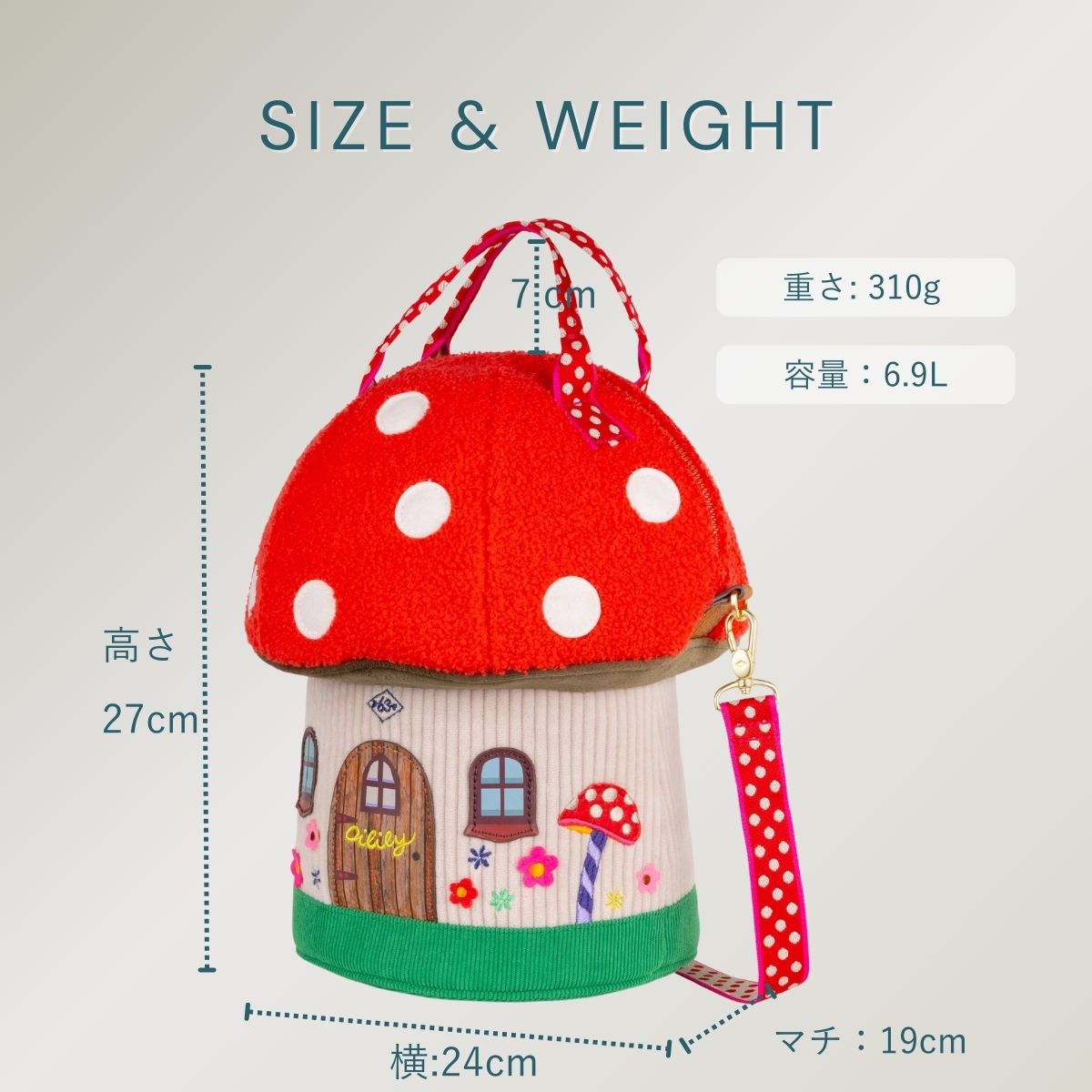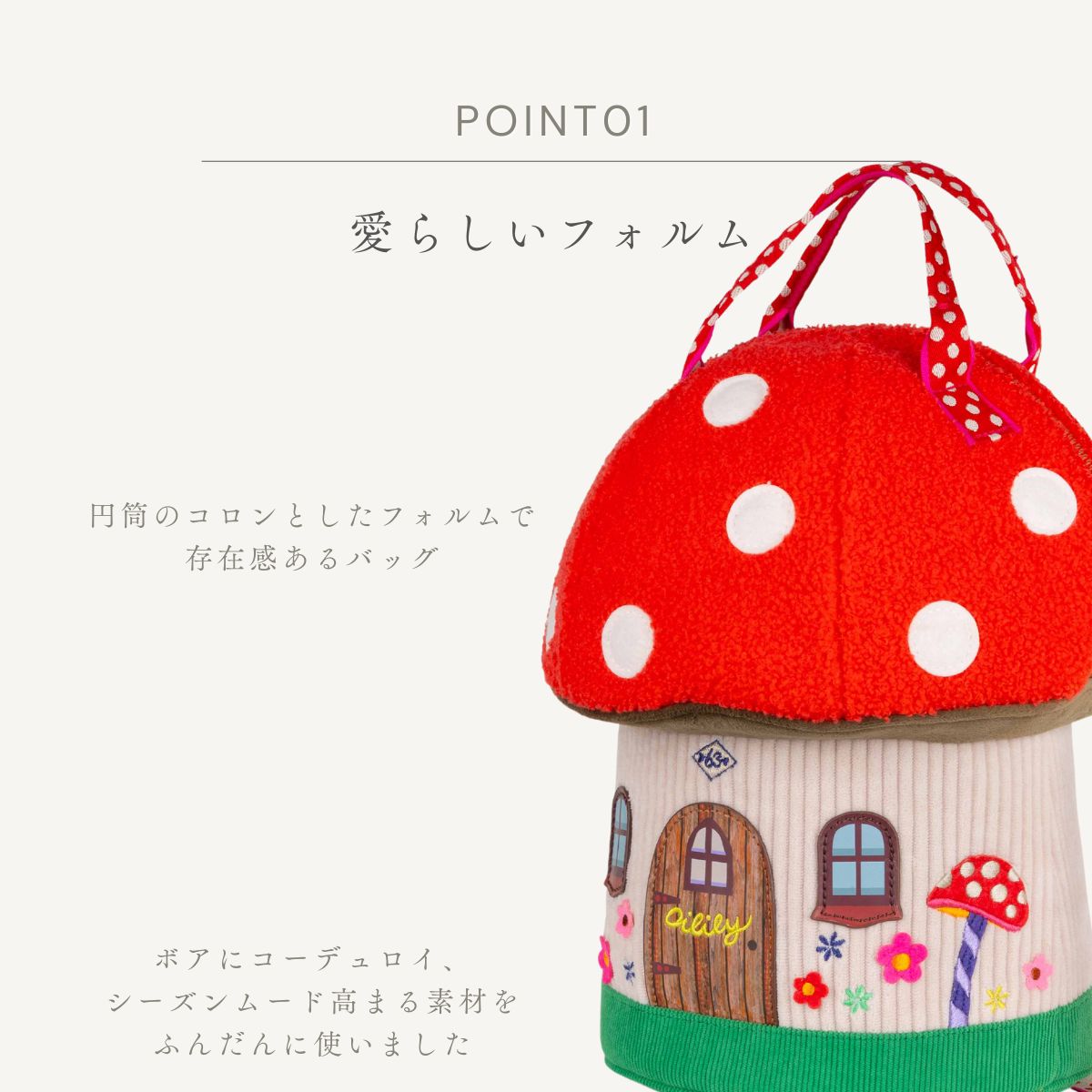 円筒のコロンとしたフォルムと遊び心溢れるきのこデザインでコーディネートの主役になること間違いなし。みんなの視線を独り占めしちゃおう!