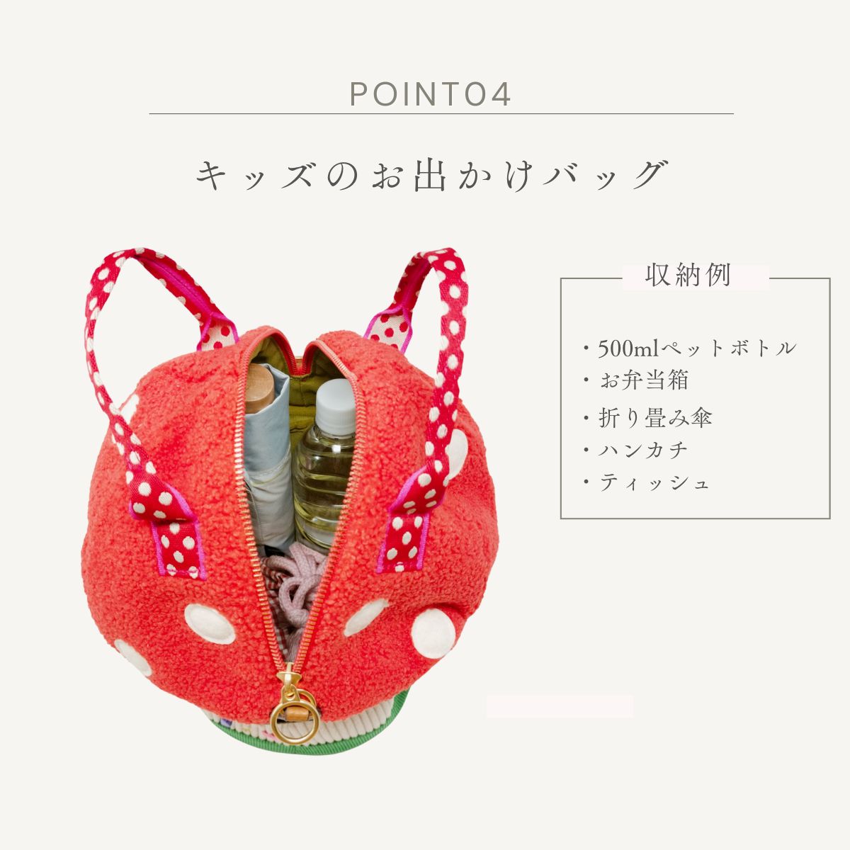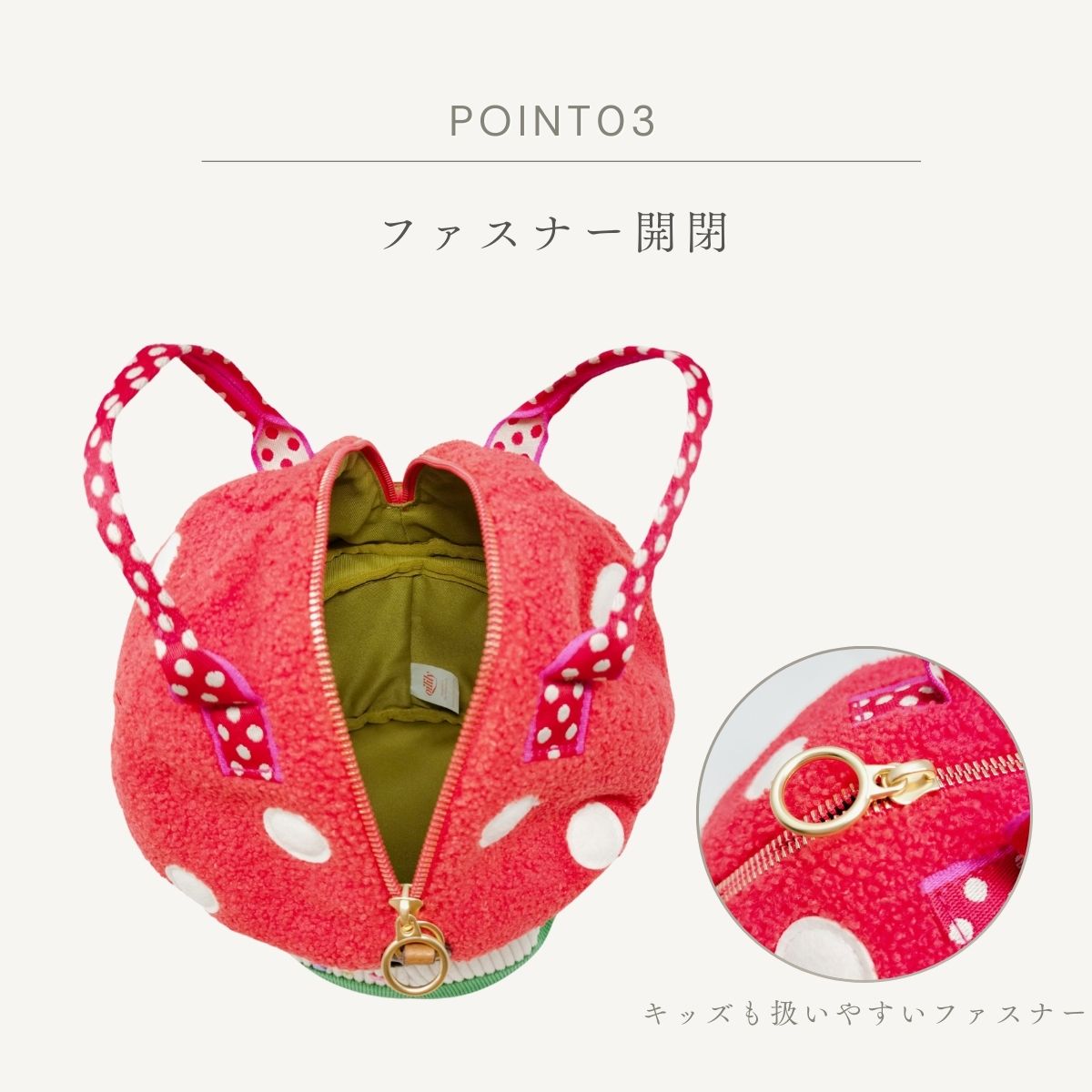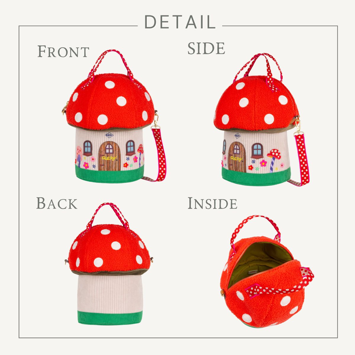 円筒のコロンとしたフォルムと遊び心溢れるきのこデザインでコーディネートの主役になること間違いなし。みんなの視線を独り占めしちゃおう!
