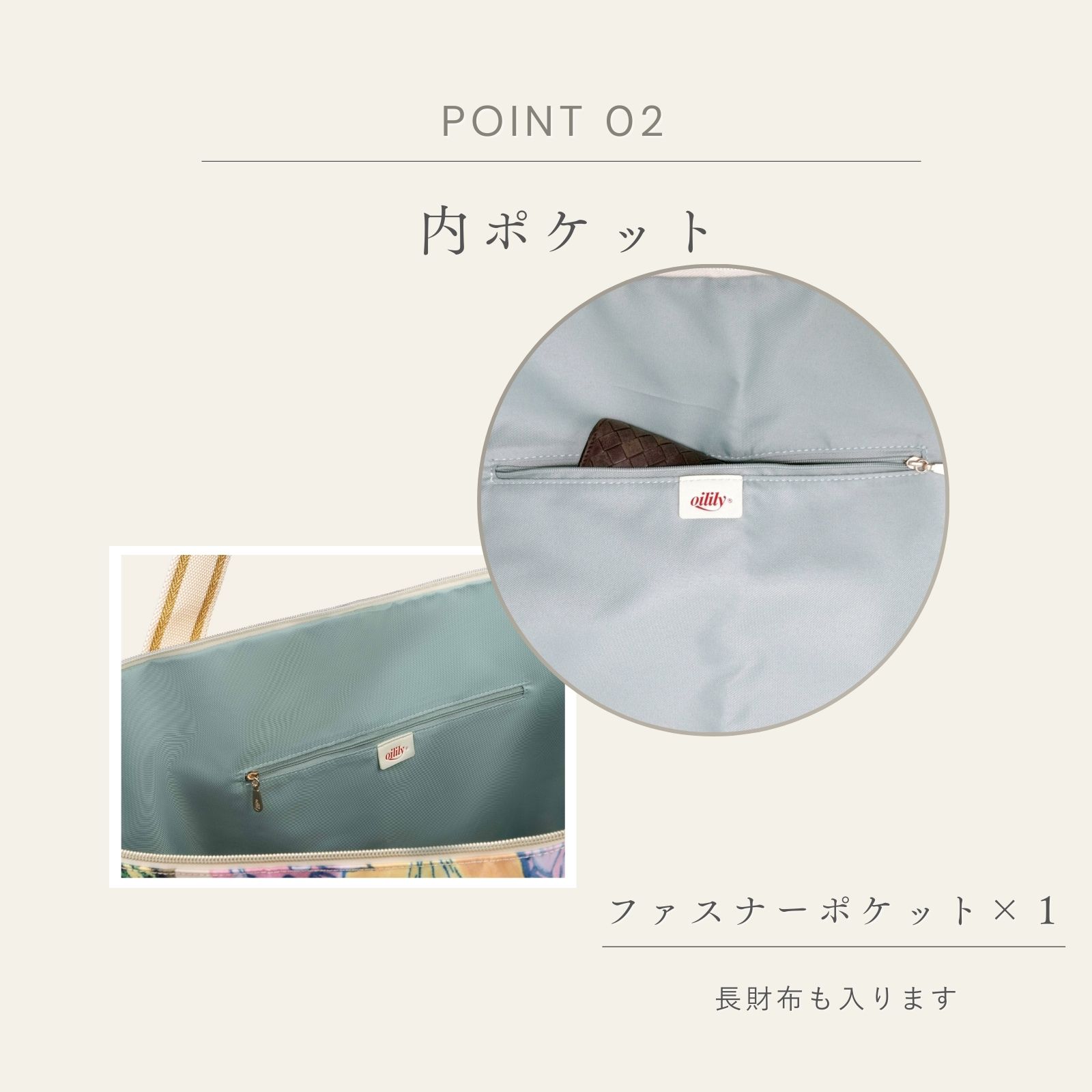 ジッパー付きメインコンパートメント、ジッパーポケット付き