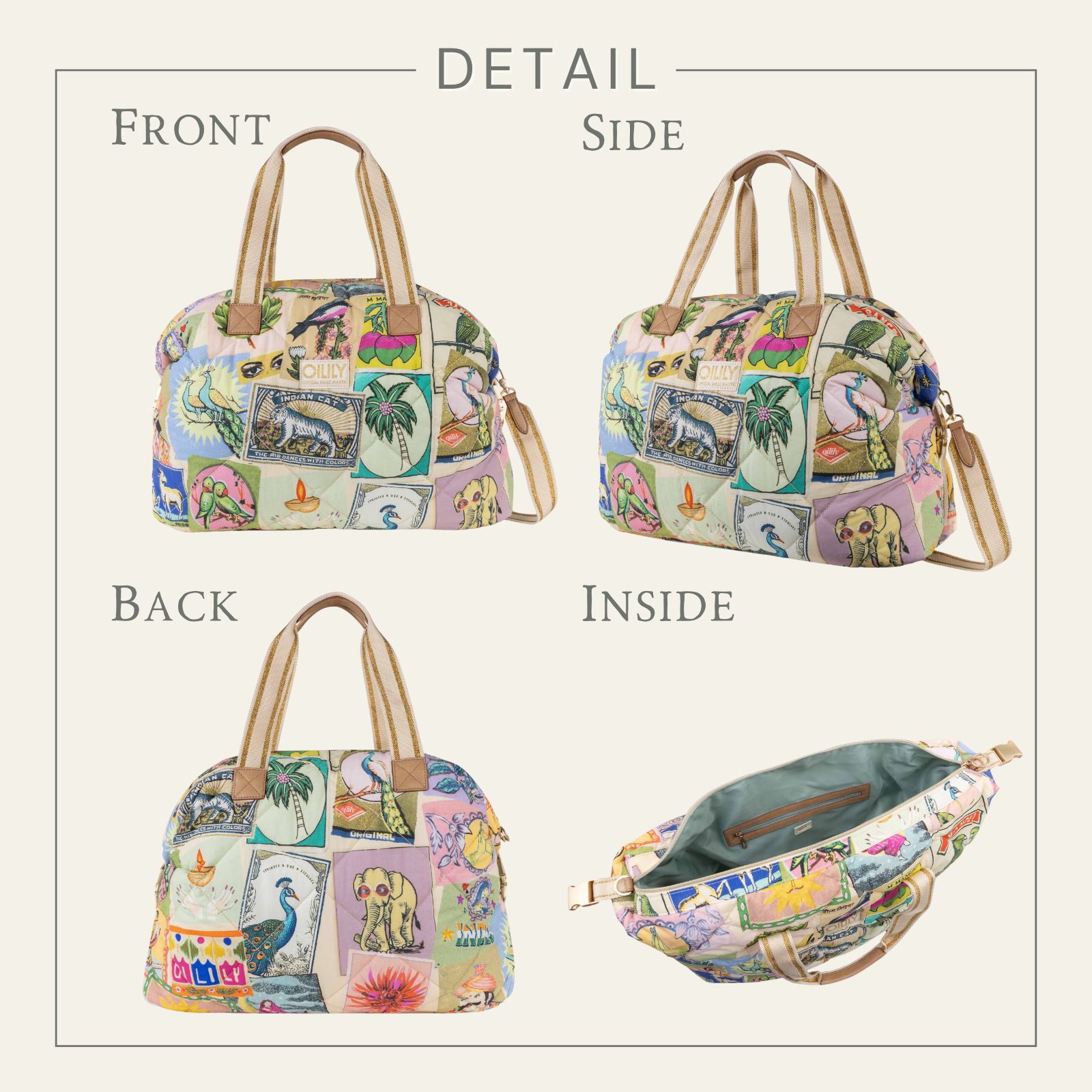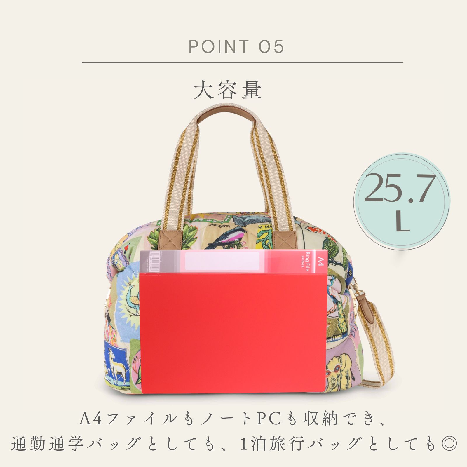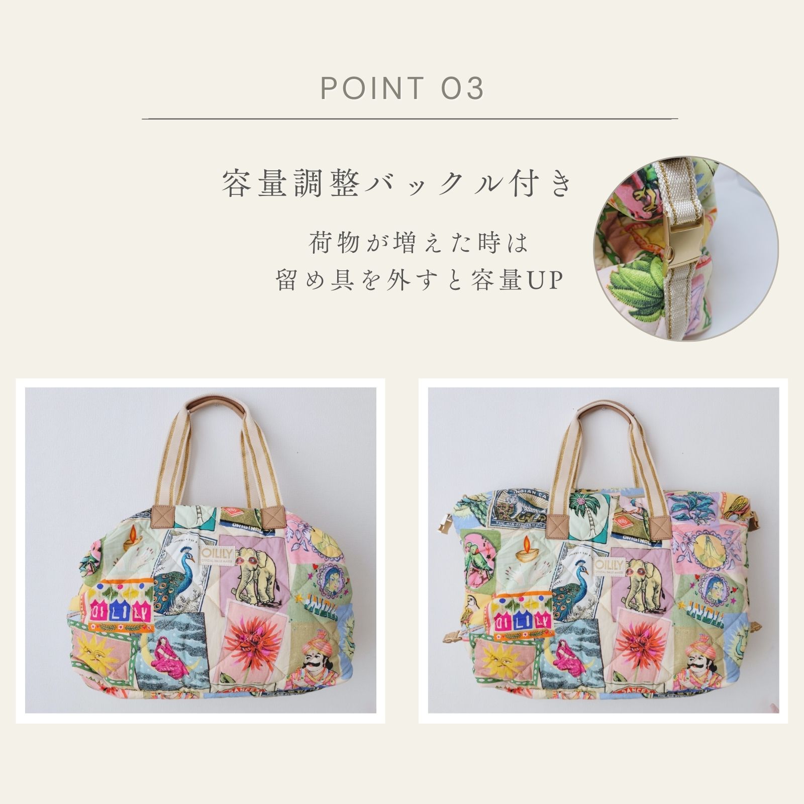 旅行にぴったりなサイズの大きなパデットバッグ。両サイドの留め具を使ってバッグを小さくすることができます。